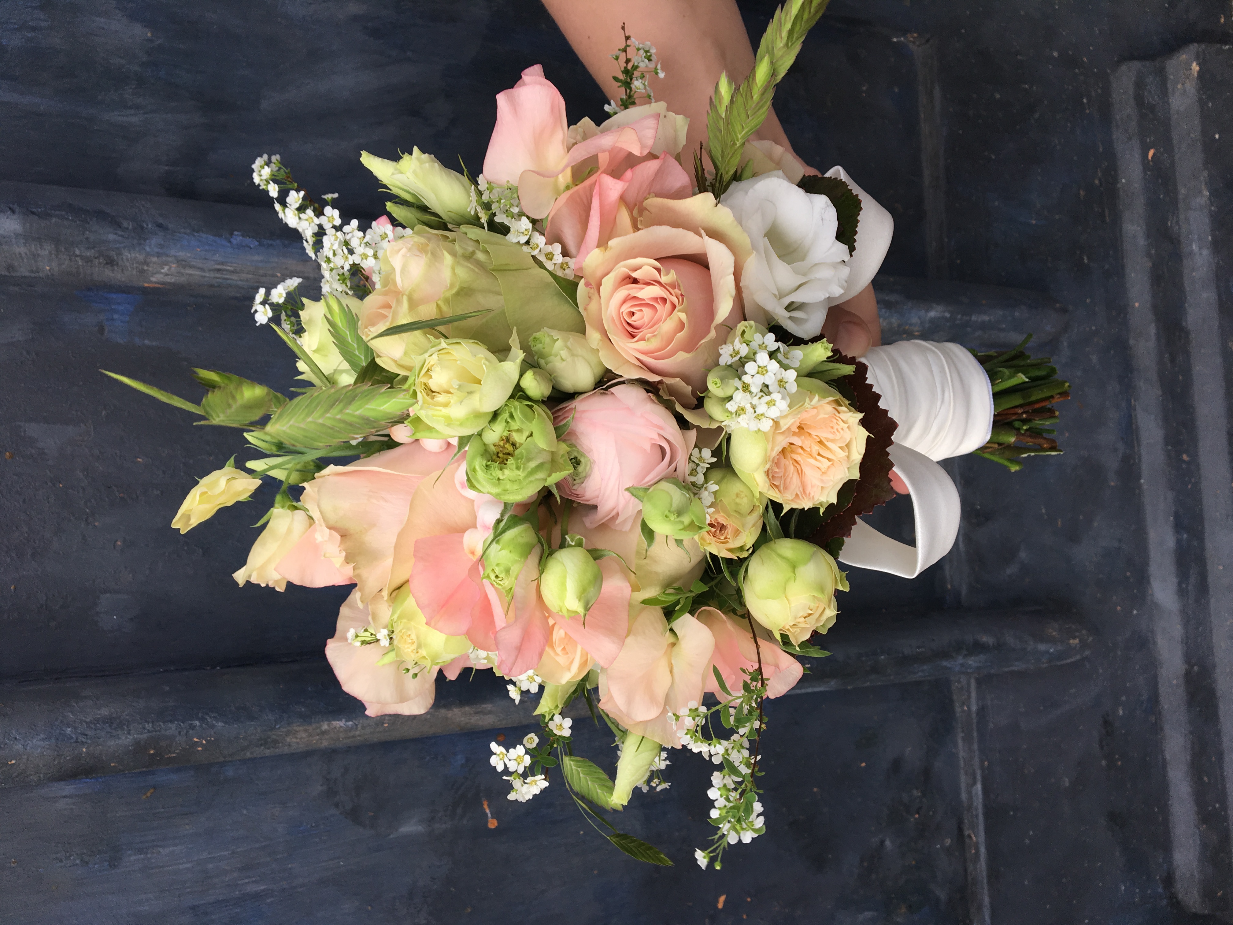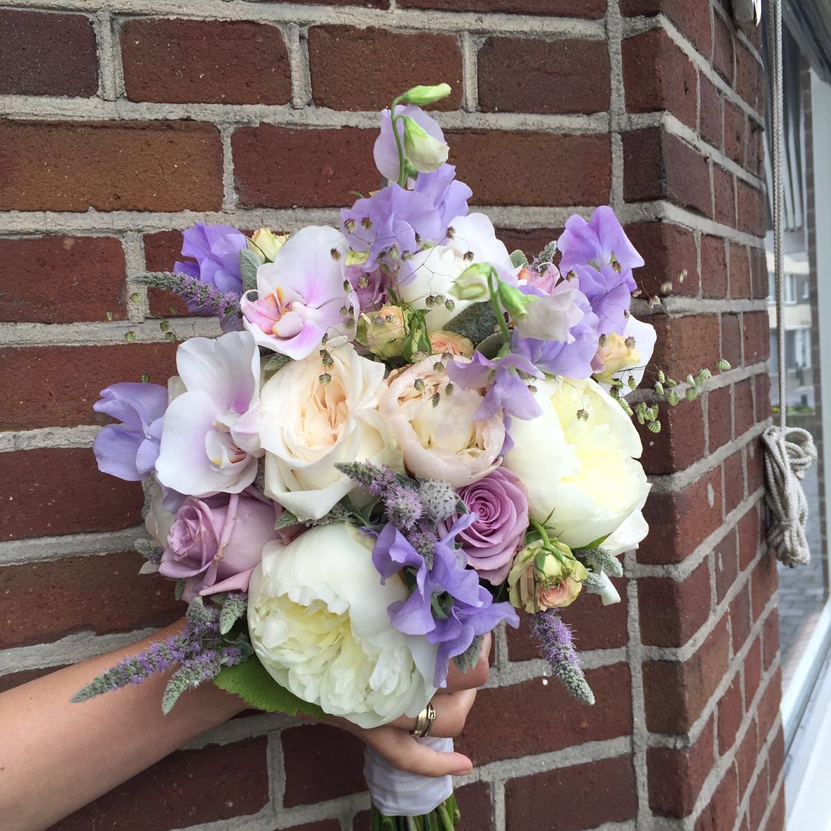 In het bruidsboeket zit, pioenrozen, lathyrus, trosrozen, rozen, grasjes, orchidee en munt.