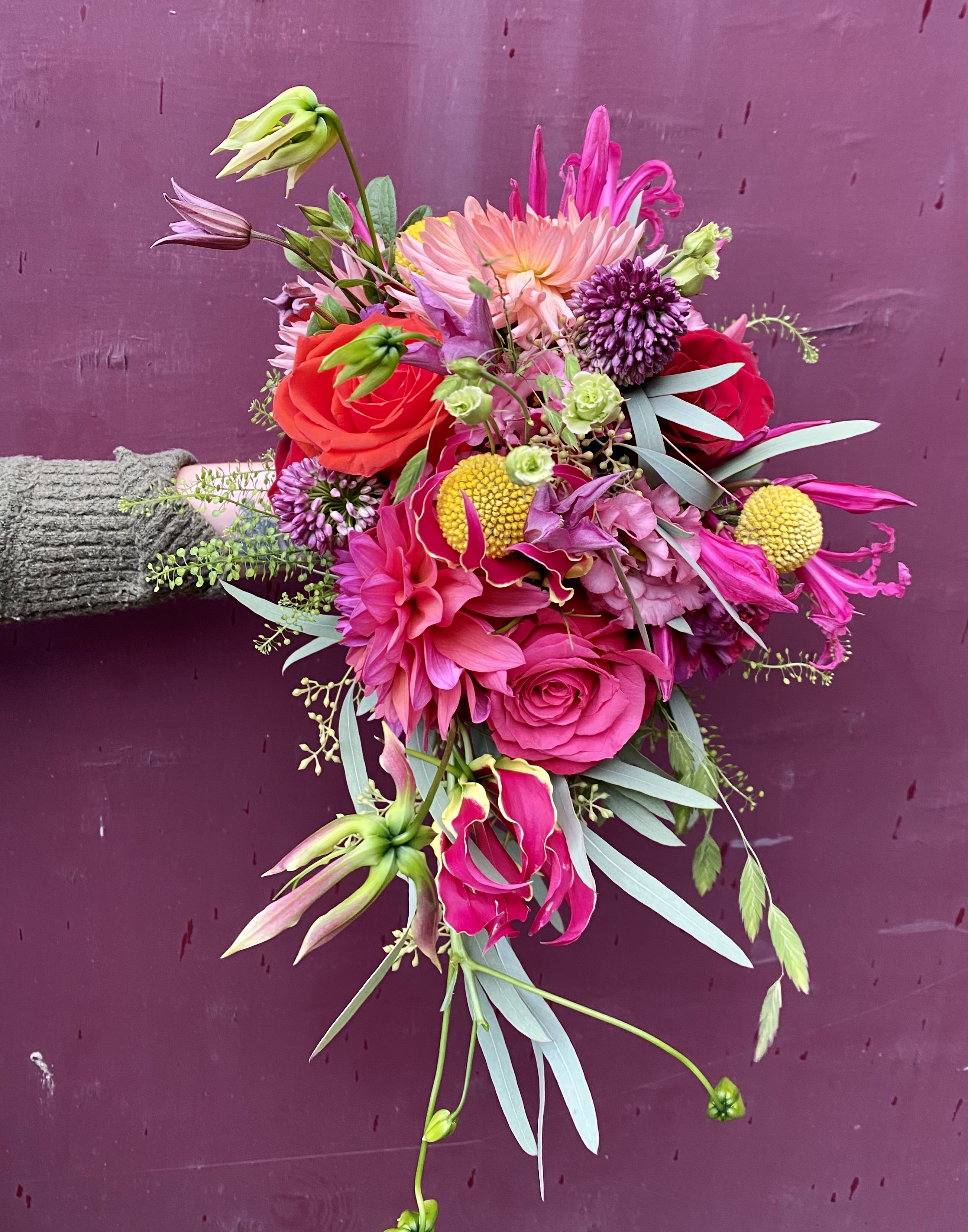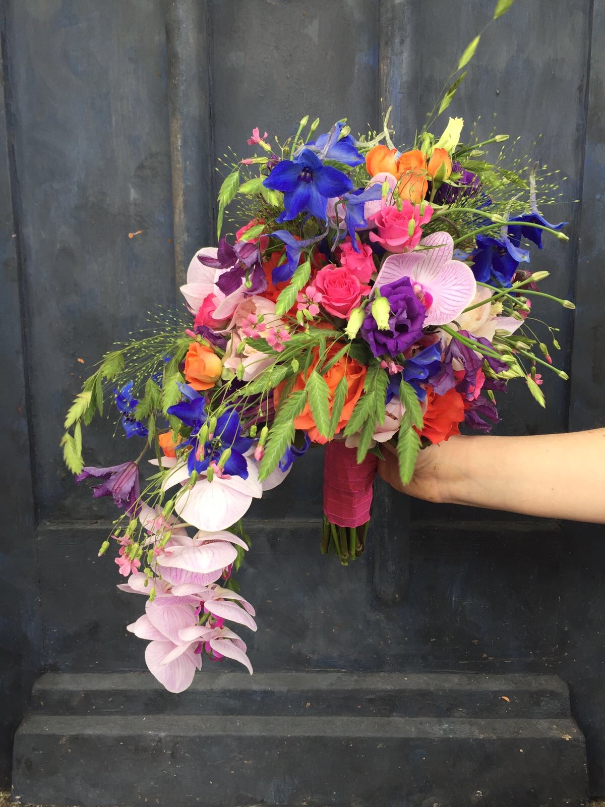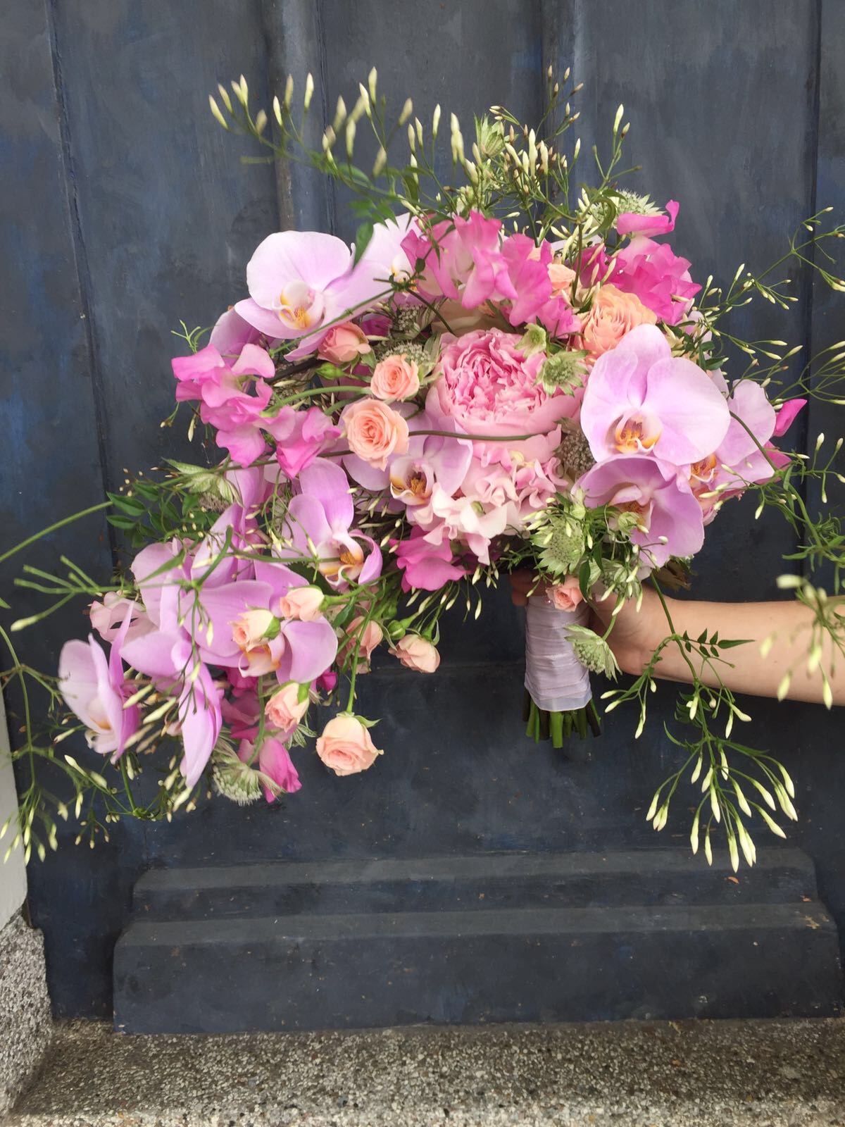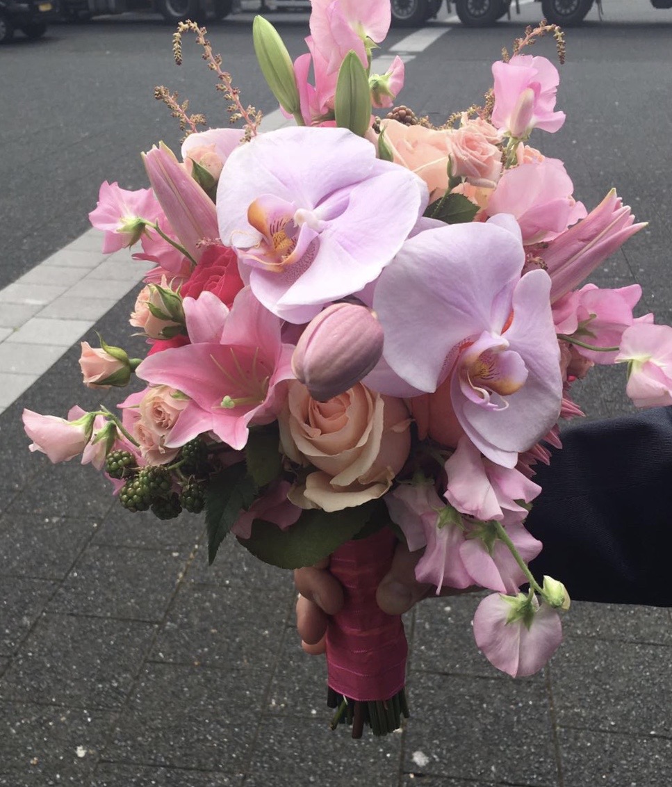 In het boeket zit: orchidee, delphinium, grasjes, lisianthus, allium, sapponaria, clematis, trosroosjes en rozen.