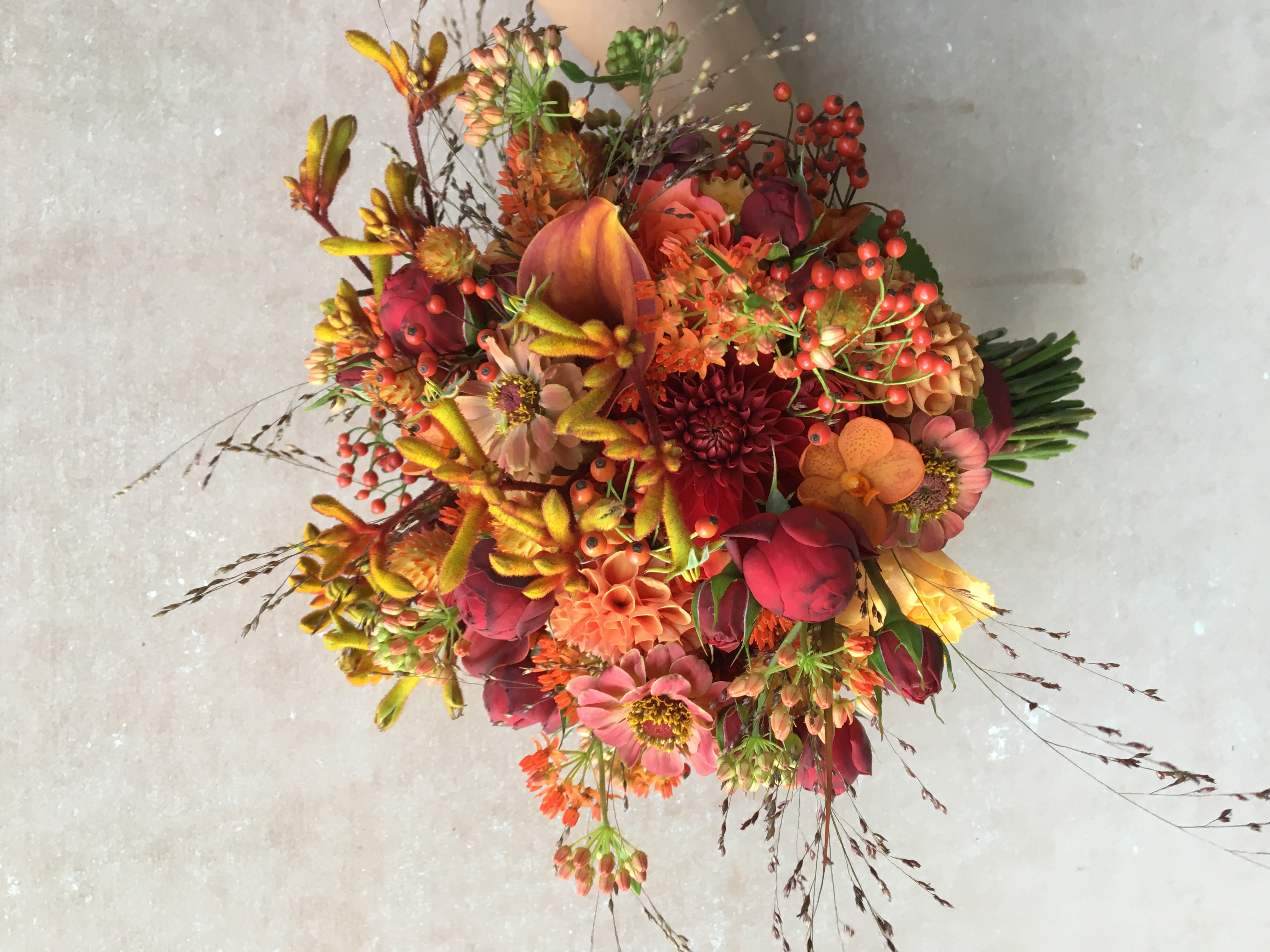In het boeket zit: kangaroepootjes, rozenbottel, rozen, dahlia, zinnia, orchidee, grasjes en asclepia.