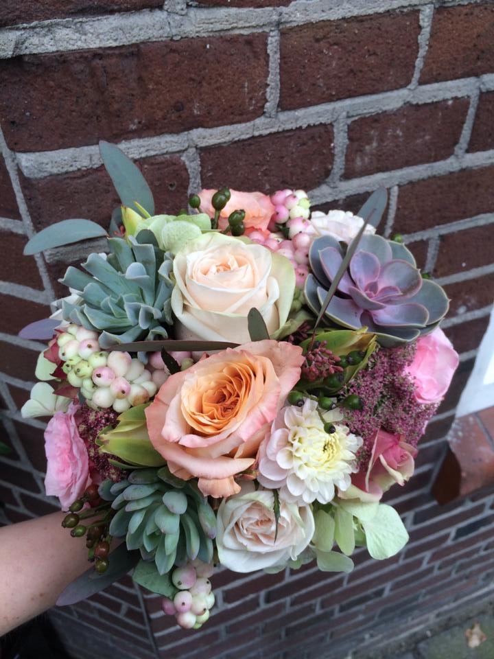 Pastel bruidsboeket met vetplantjesPastelkleurig bruidsboeket met vetplantjes en bloemen.