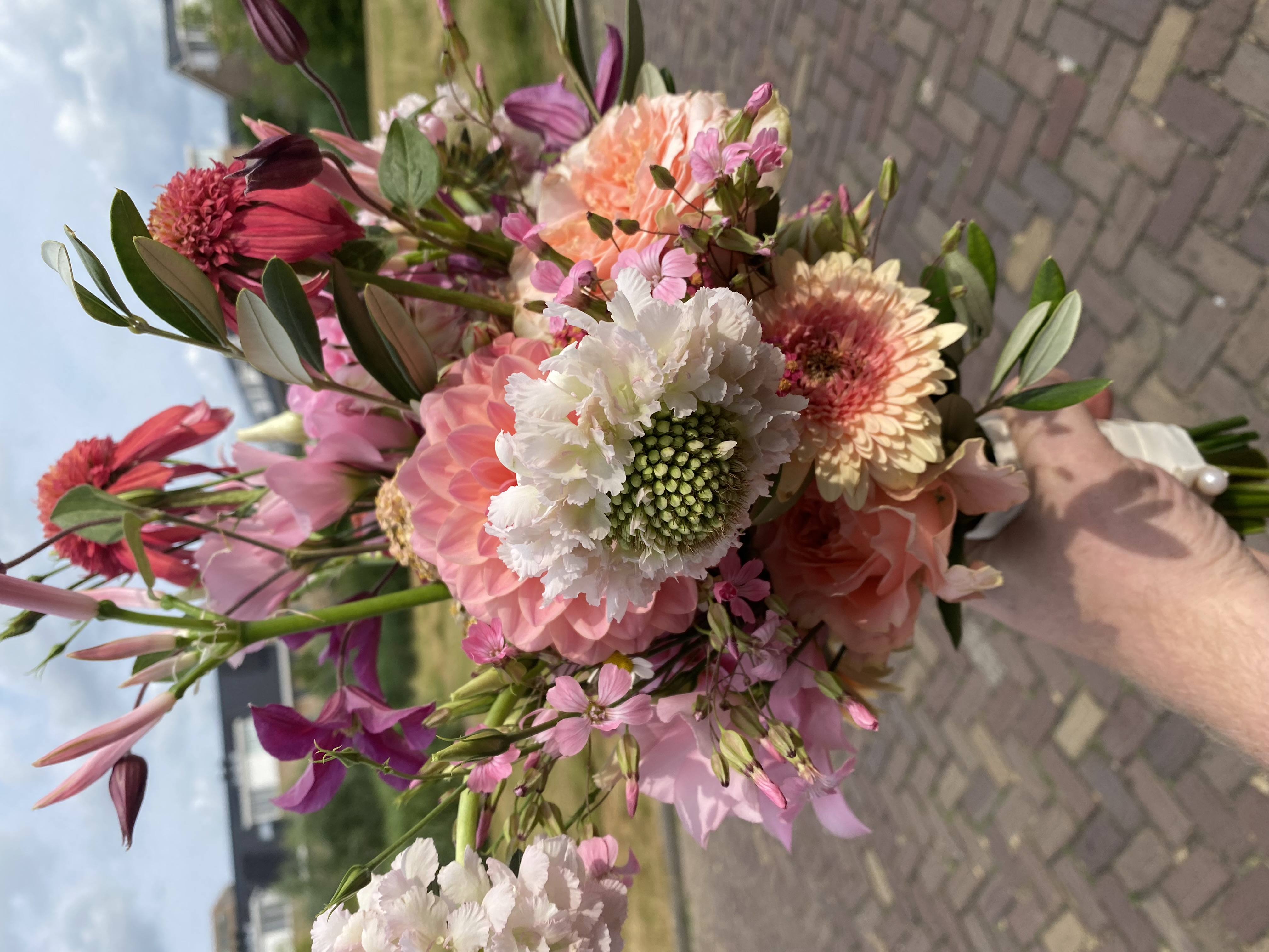 In het boeket zit: sapponaria, rudbeckia, nerine, lisianthus, scabiosa, anjers, gebera. lathyrus, rozen, clematis en olijfblad.