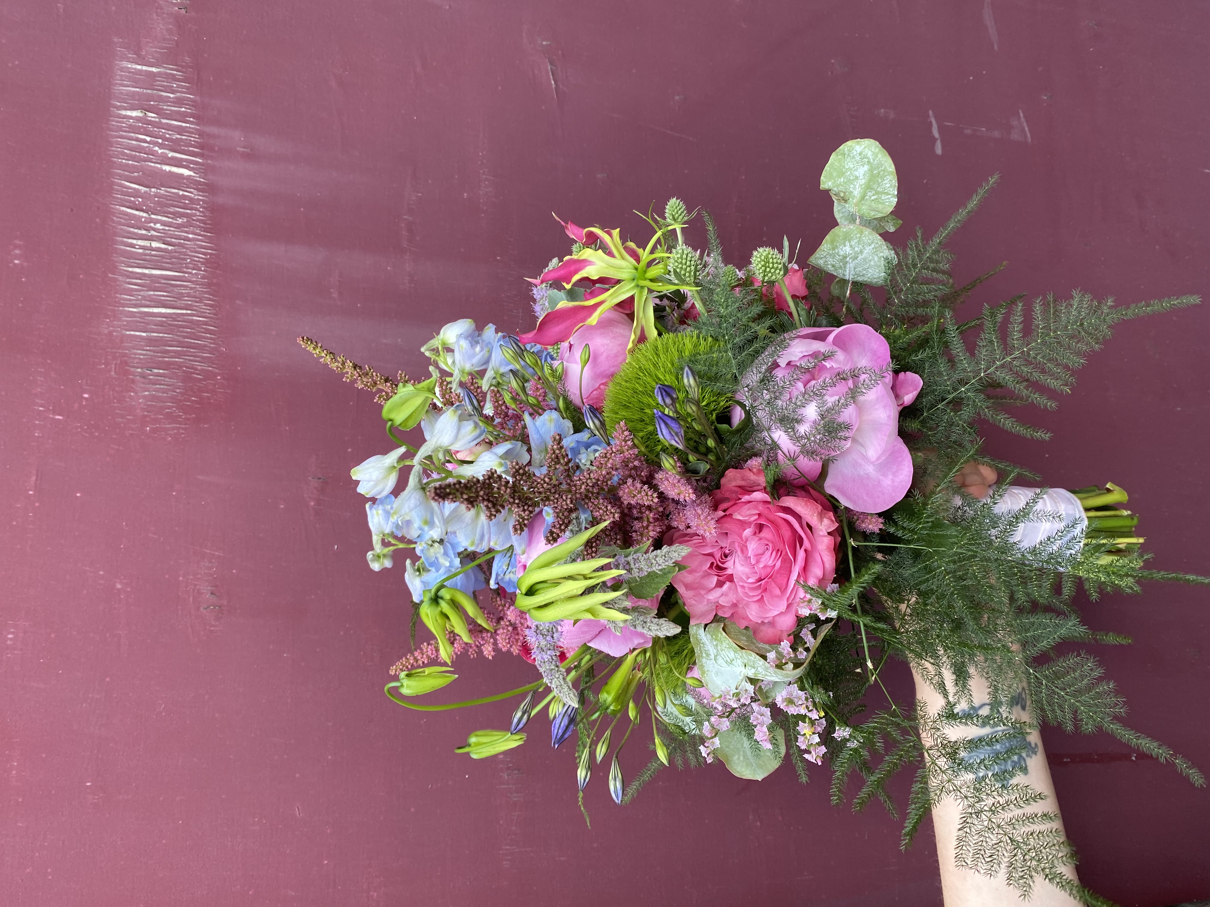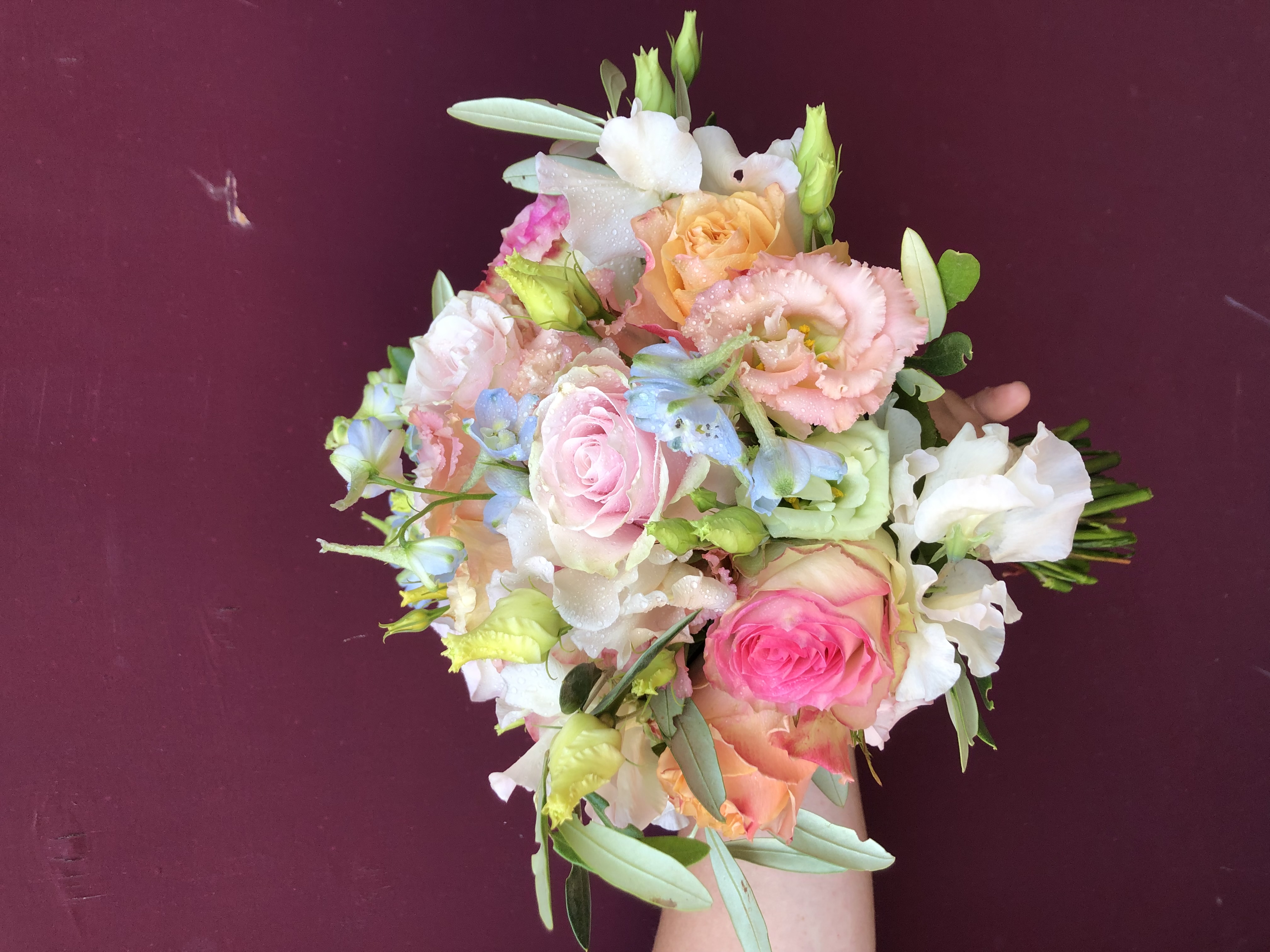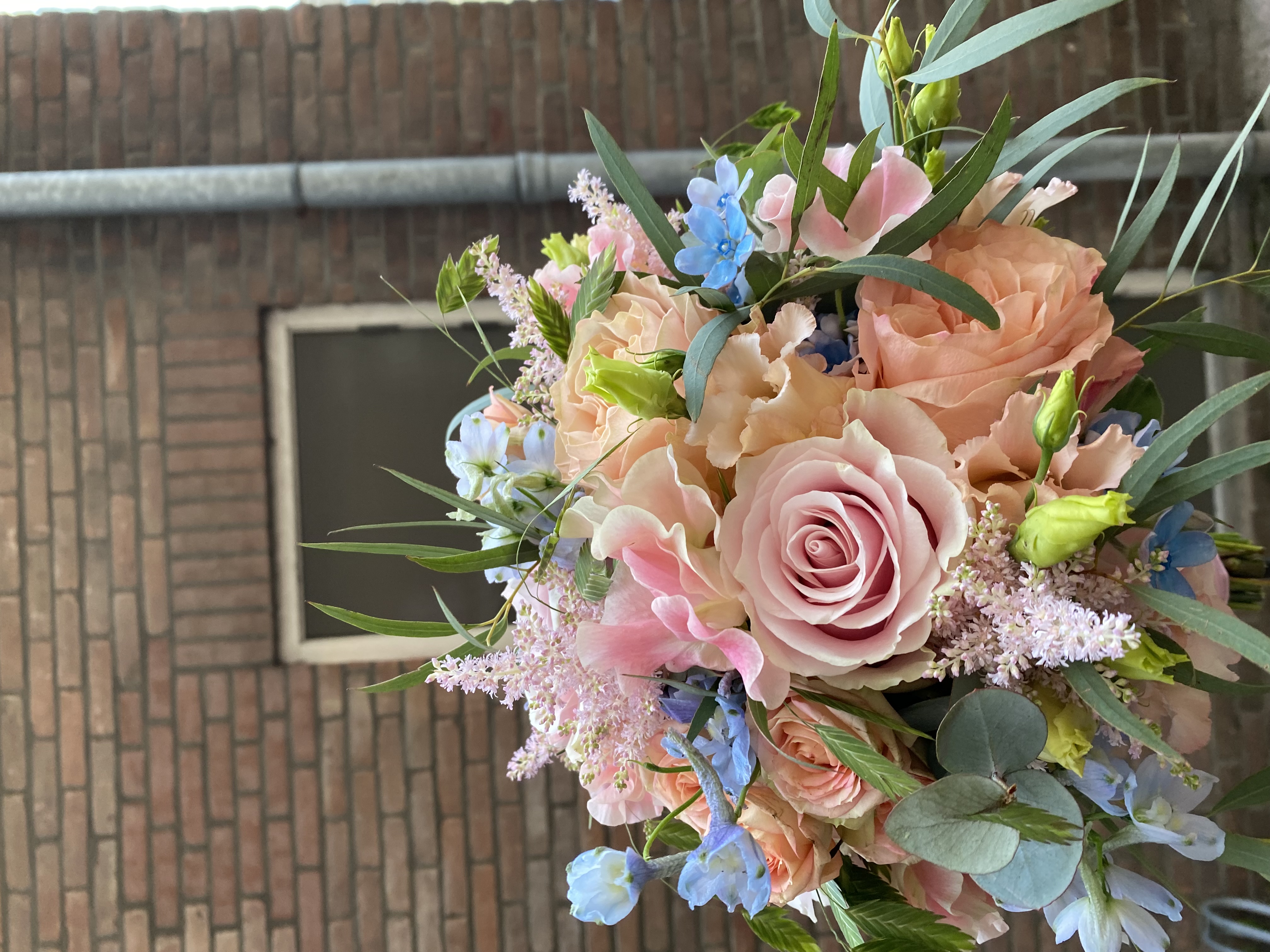 In het boeket zit: Astilbe, lathyrus, trosrozen, grasjes, delphinium en verschillende soorten eucalipthus.
