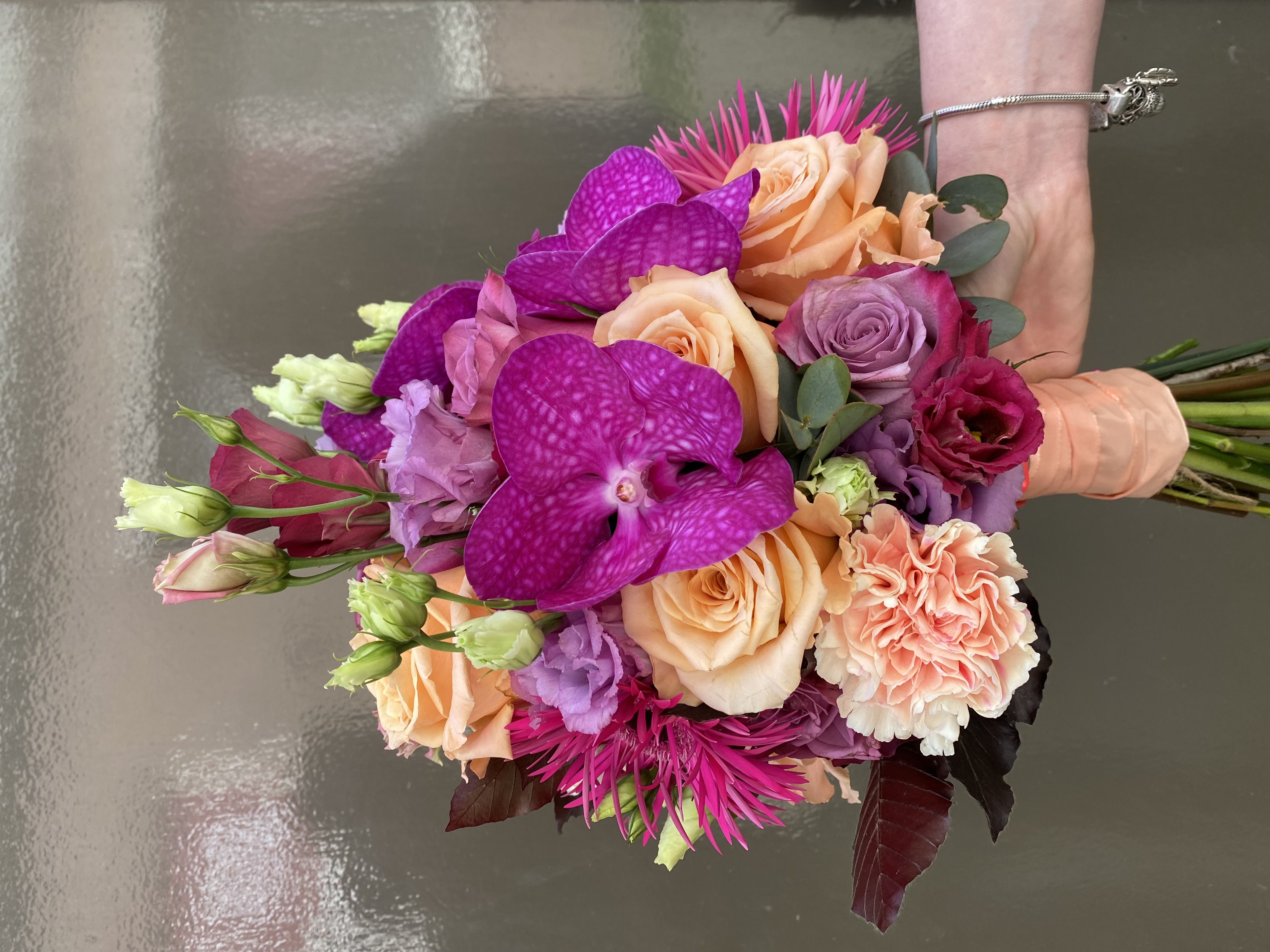In het bruidsboeket zitten, rozen, anjers, vanda orchidee, lisianthus, gebera en eucalipthus.