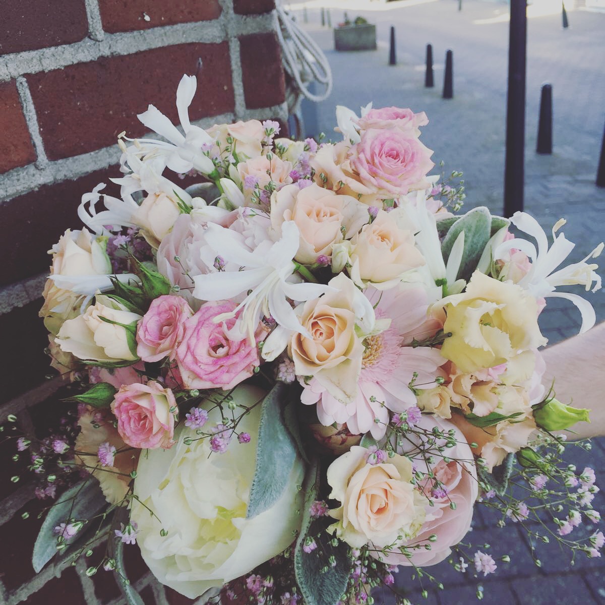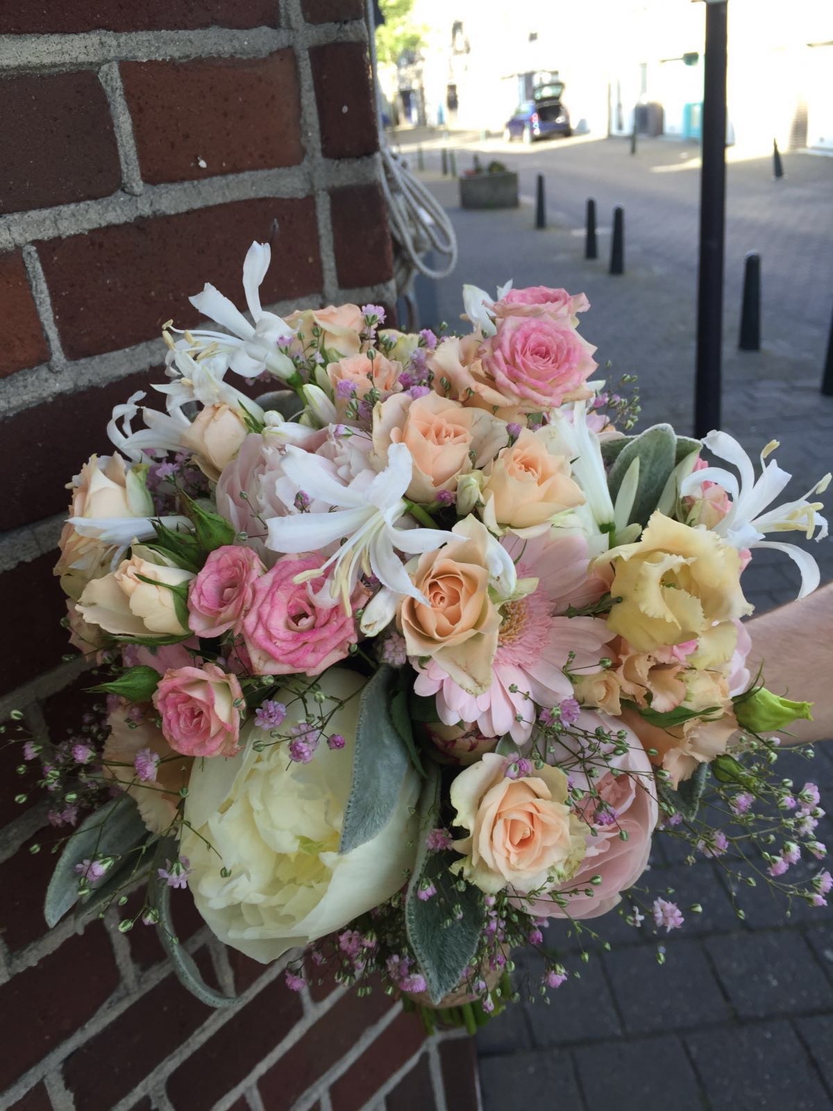 In het bruidsboeket zitten, rozen, trosrozen, nerine, gipskruid, stachus, gerbera en lisianthus.