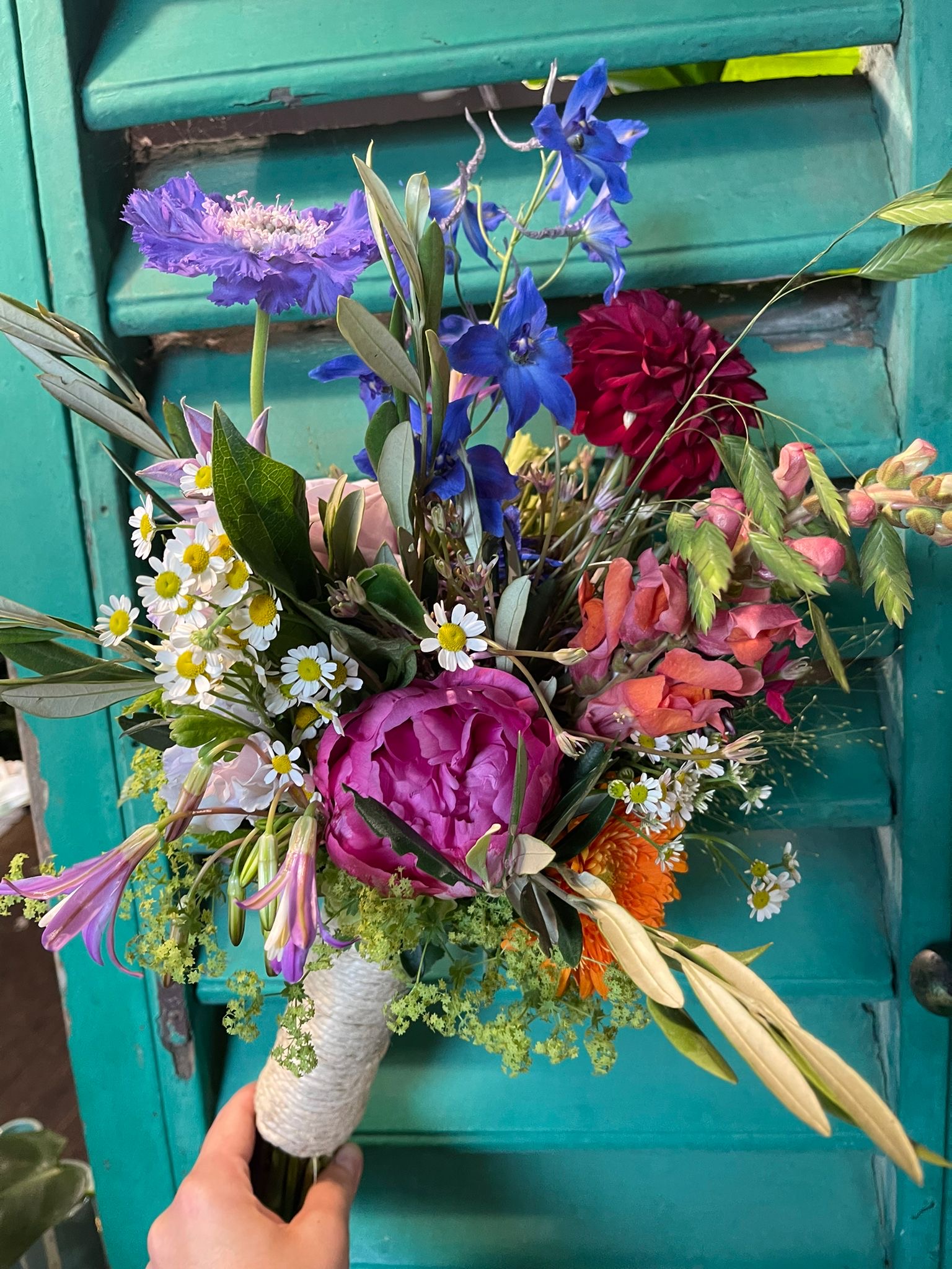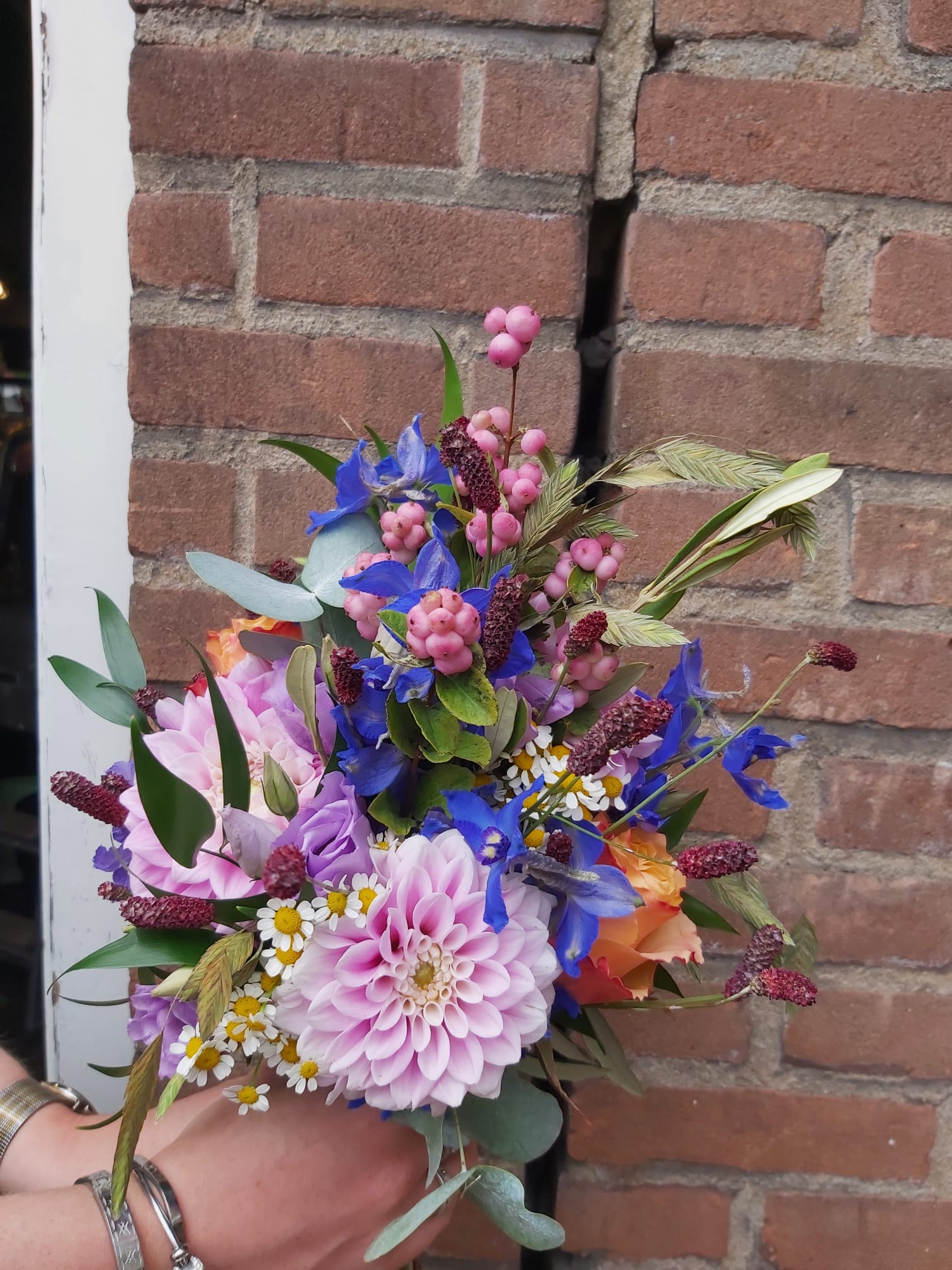 In het boeket zit: rozen, klapbes, pimpernel, kamille, dahlia, lisianthus, delphinium, eucalipthus en olijfblad.