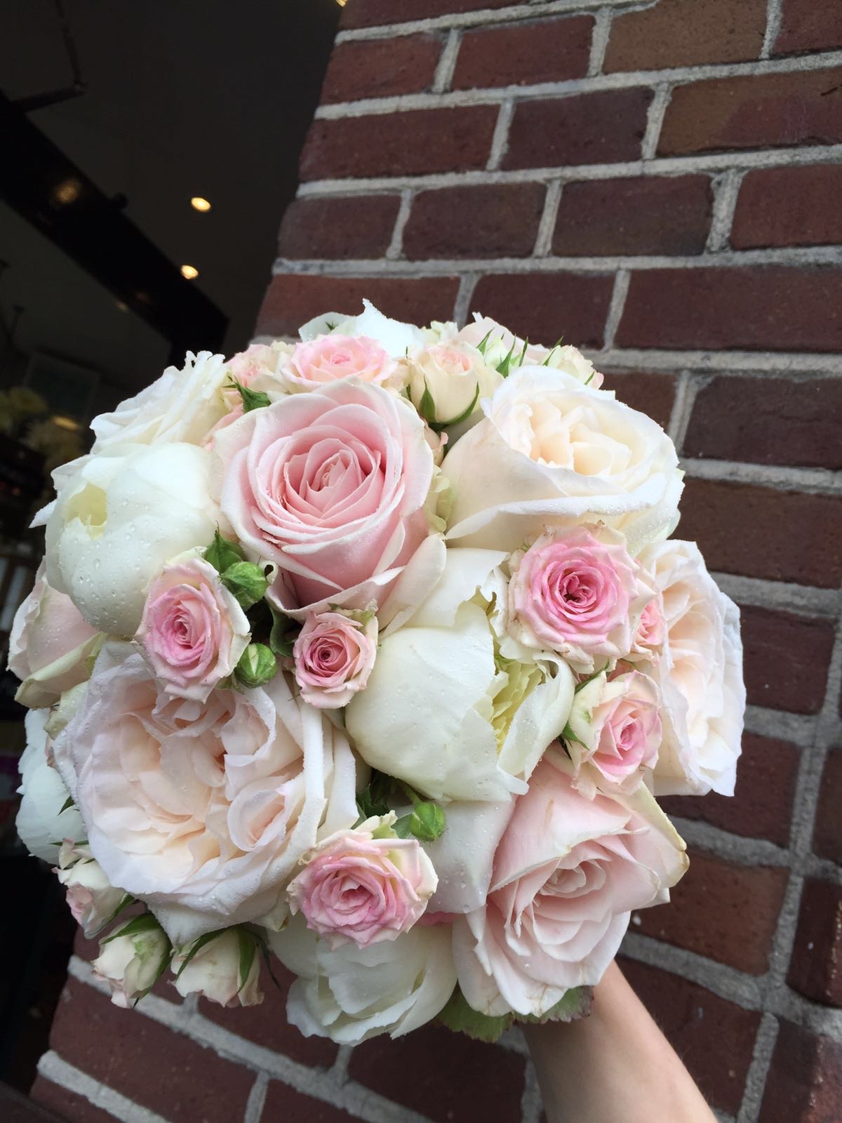 Bruidsboeket wit rozeEen zoet bruidsboeket met pioenrozen, rozen, gipskruid, olijfblad, astrantia, eucalipthus, gerbera en lisianthus
