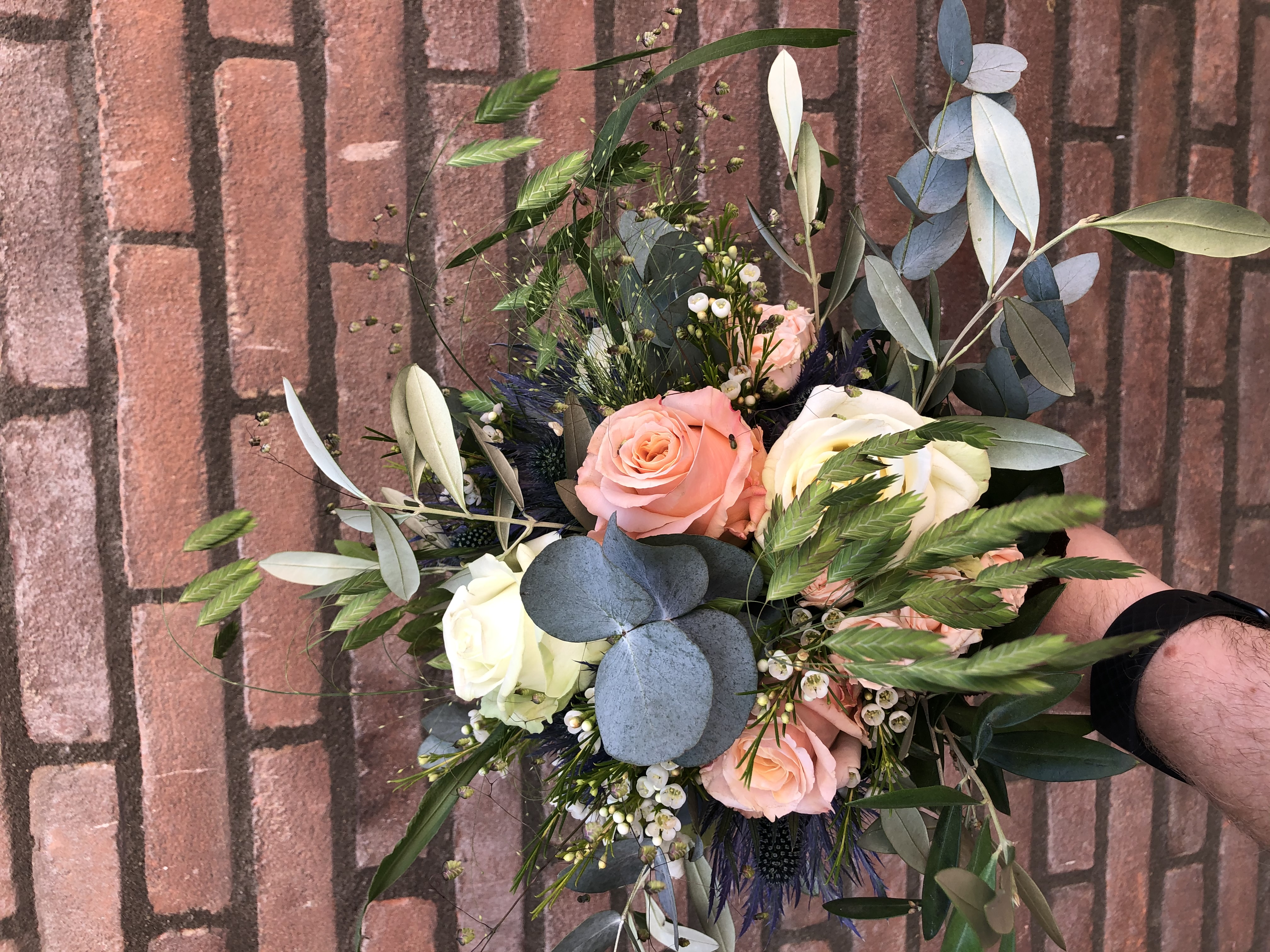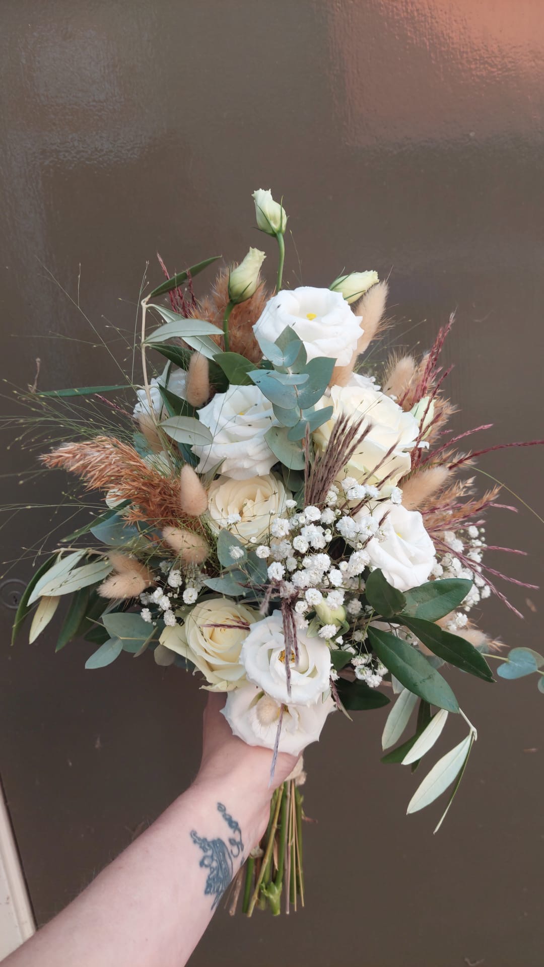 In het bruidsboeket, zitten grassen, gipskruid, rozen, lisianthus, olijfblad en eucalipthus.