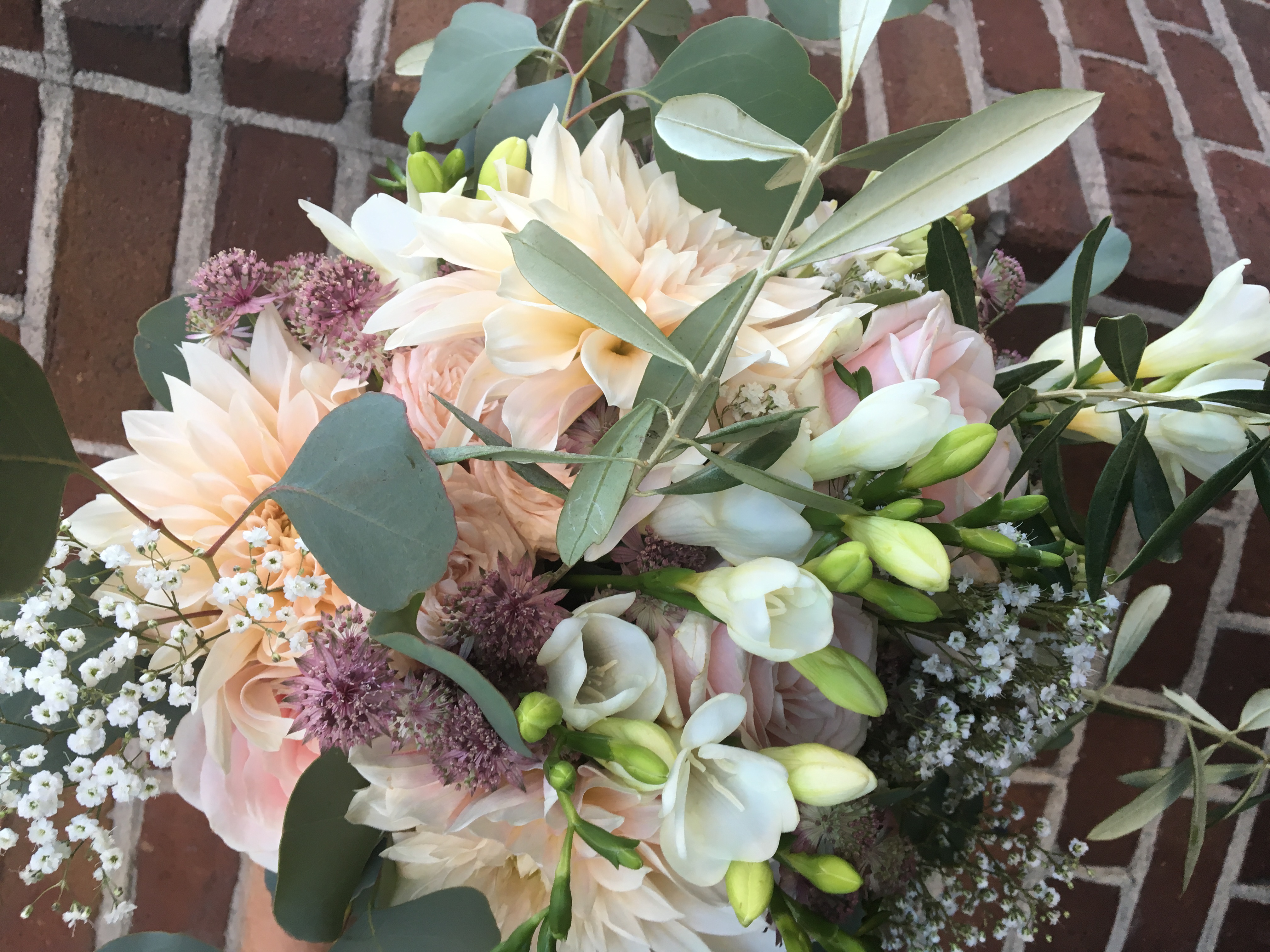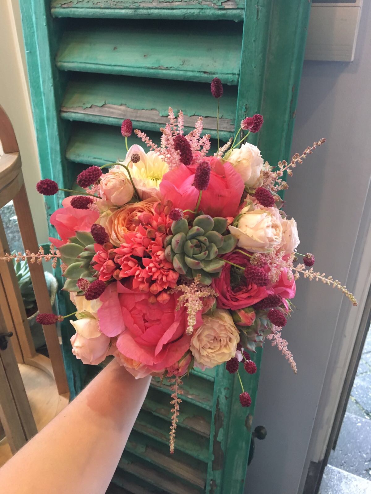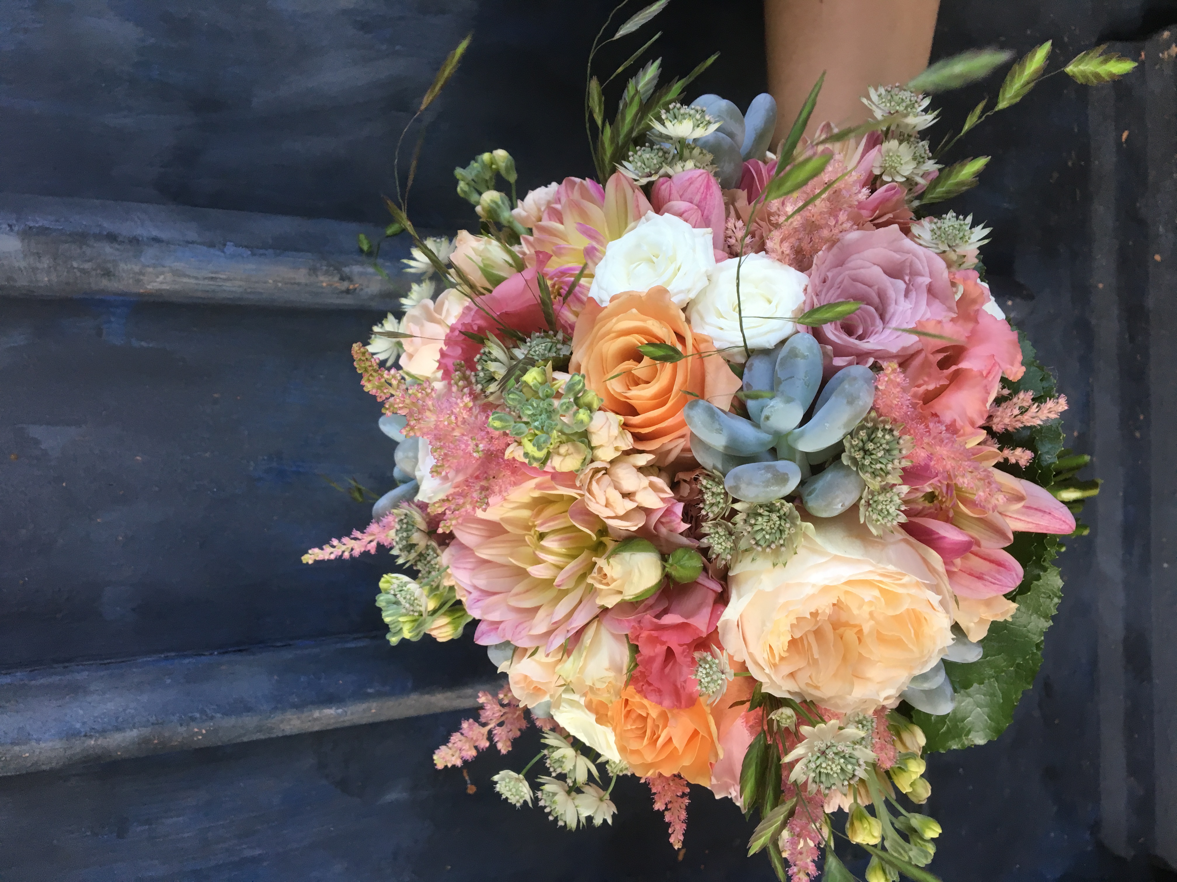 In het boeket zit, astrantia, rozen, vetplantjes, violier, dahlia, lisianthus, trosroosjes en grasjes.