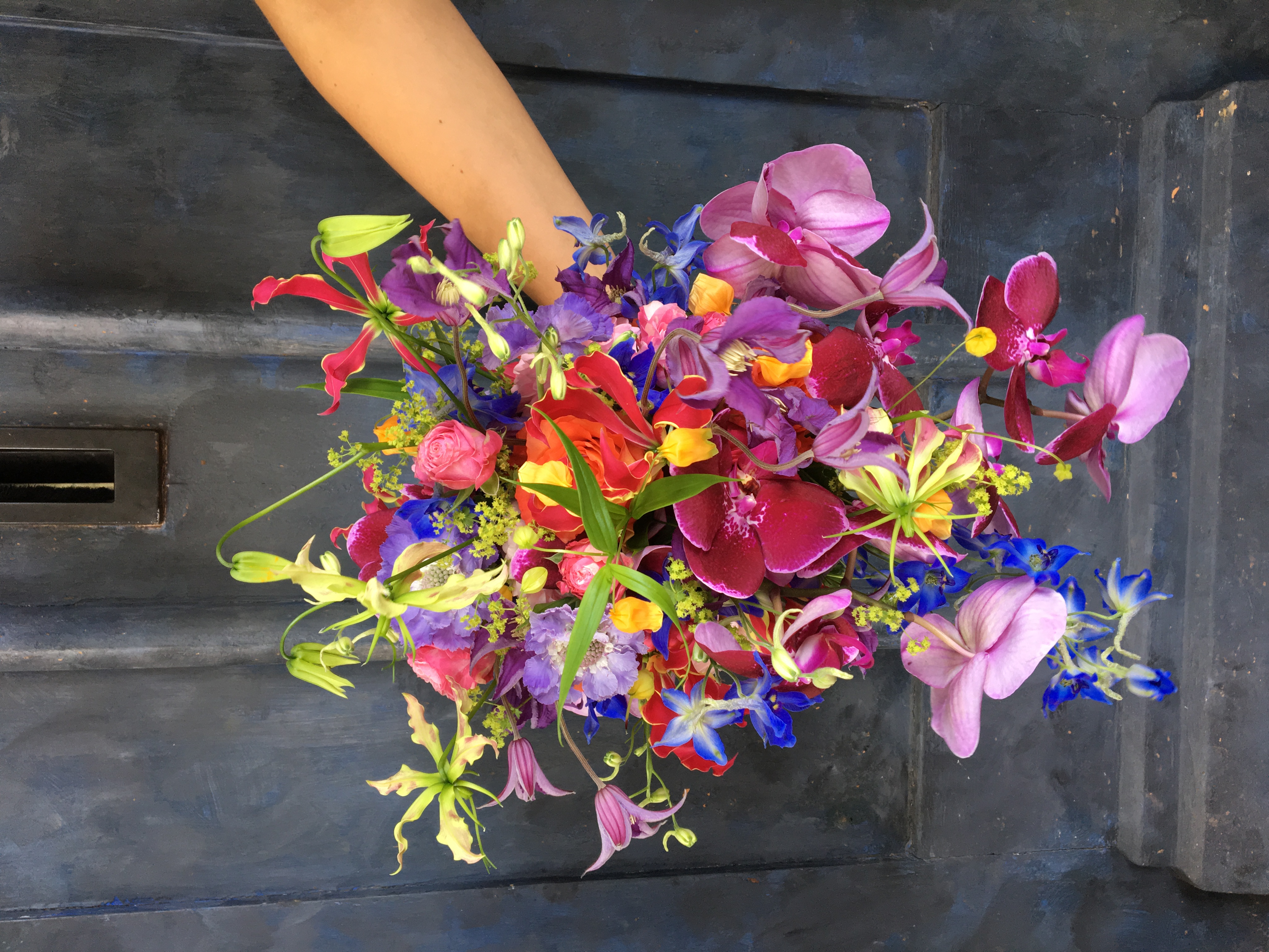 In het boeket zit: orchidee, gloriosa, delphinium, scabiosa, clematis, sandersonia, trosrozen, alchimella en rozen.