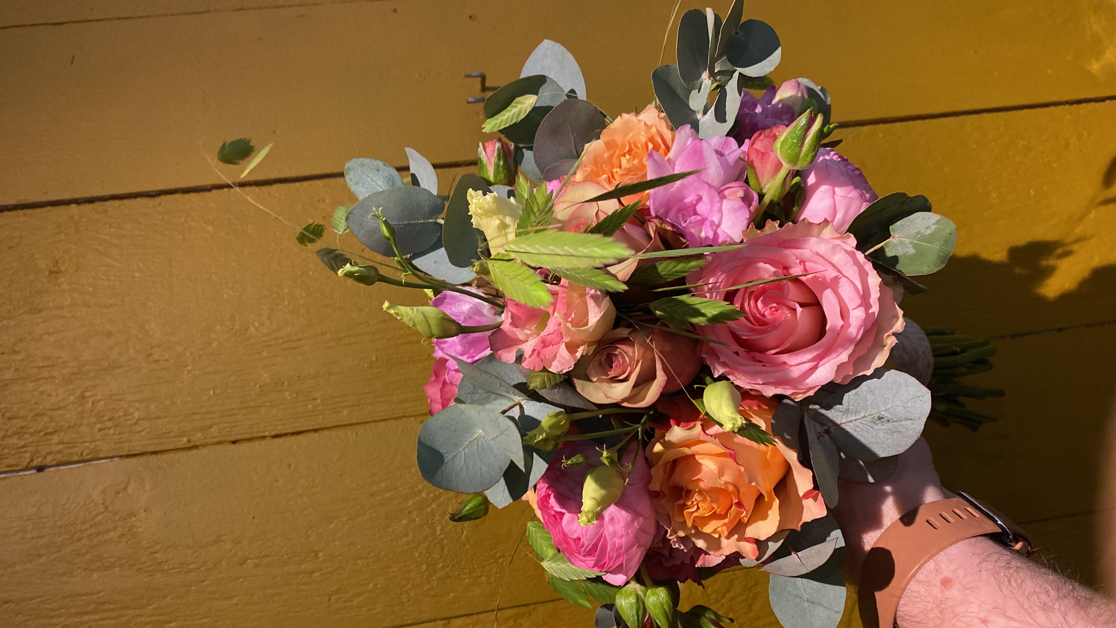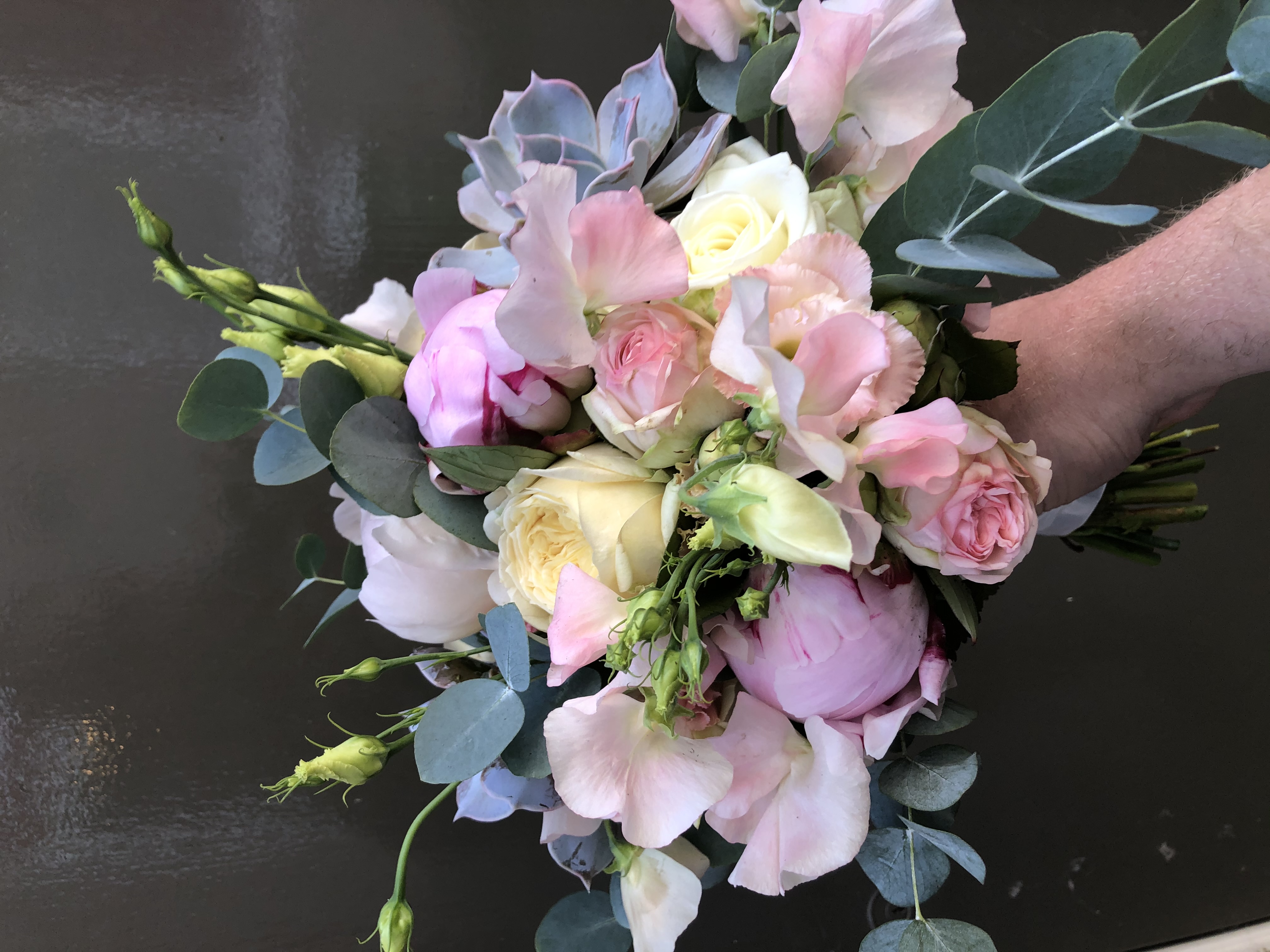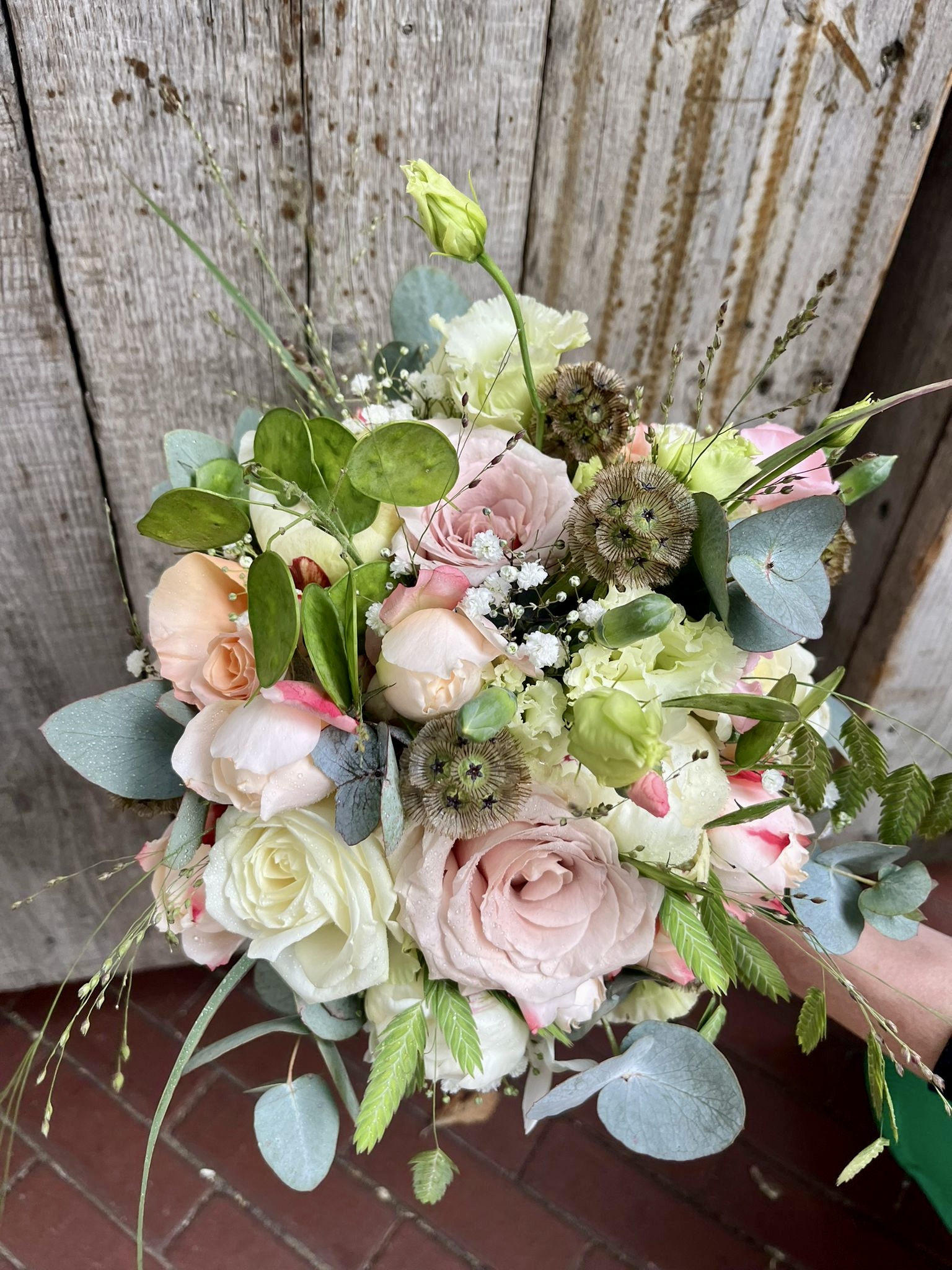 In het boeket zit, grasjes, rozen, lisianthus, pioenrozen, trosrozen en eucalipthus.