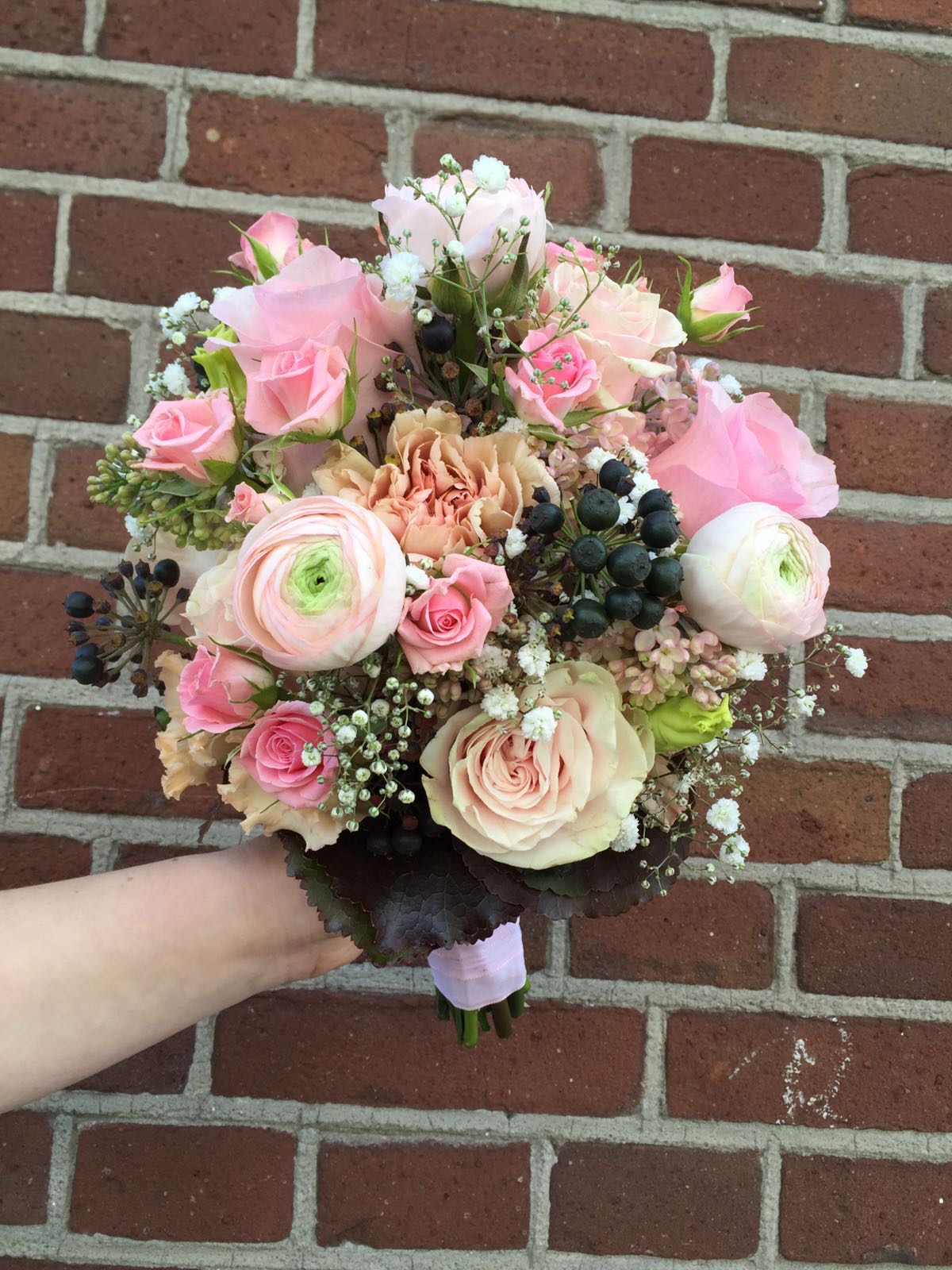 In het bruidsboeket zitten, ranonkels, anjers, gipskruid, rozen, trosrozen, lisianthus en bessen.