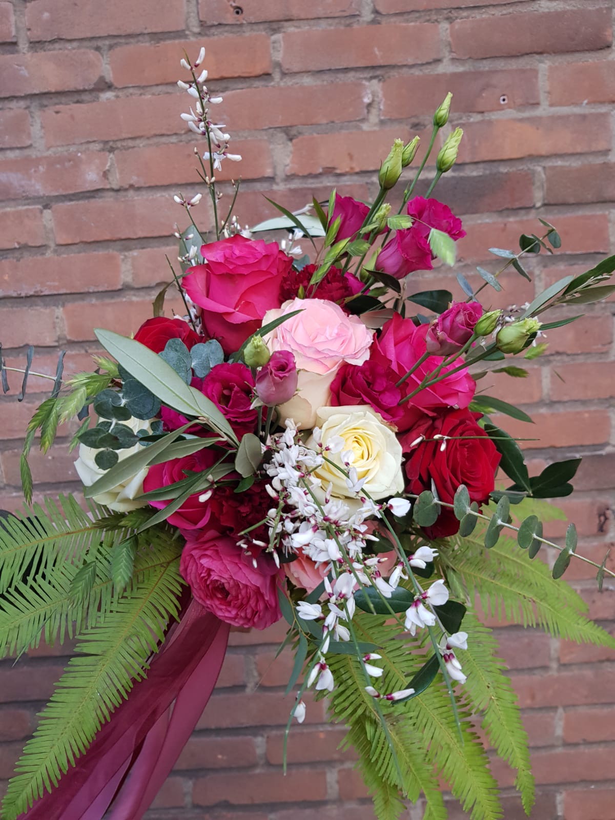 Bruidsboeket roze, rood, witEen speels bruidsbioeket in de kleuren rood, roze en wit.In het bruidsboeket zit, lisianthus, varenblad, brem, rozen, lisianthus, grasjes, olijfblad en eucalipthus.
