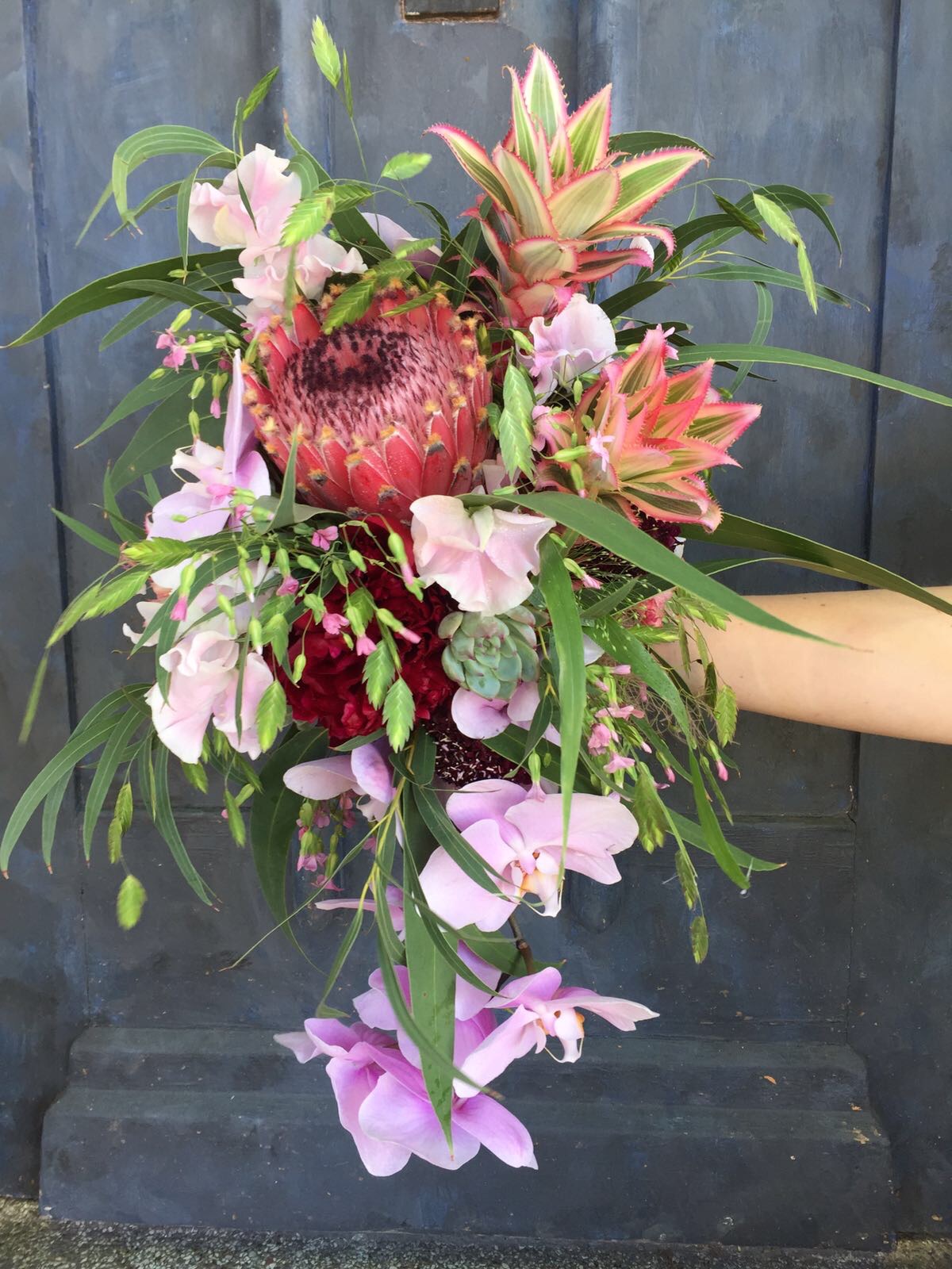 In het bruidsboeket zitten (tropische) bloemen zoals orchidee, lathyrus, grasjes, ananas, prothea, rozen, sapponaria.