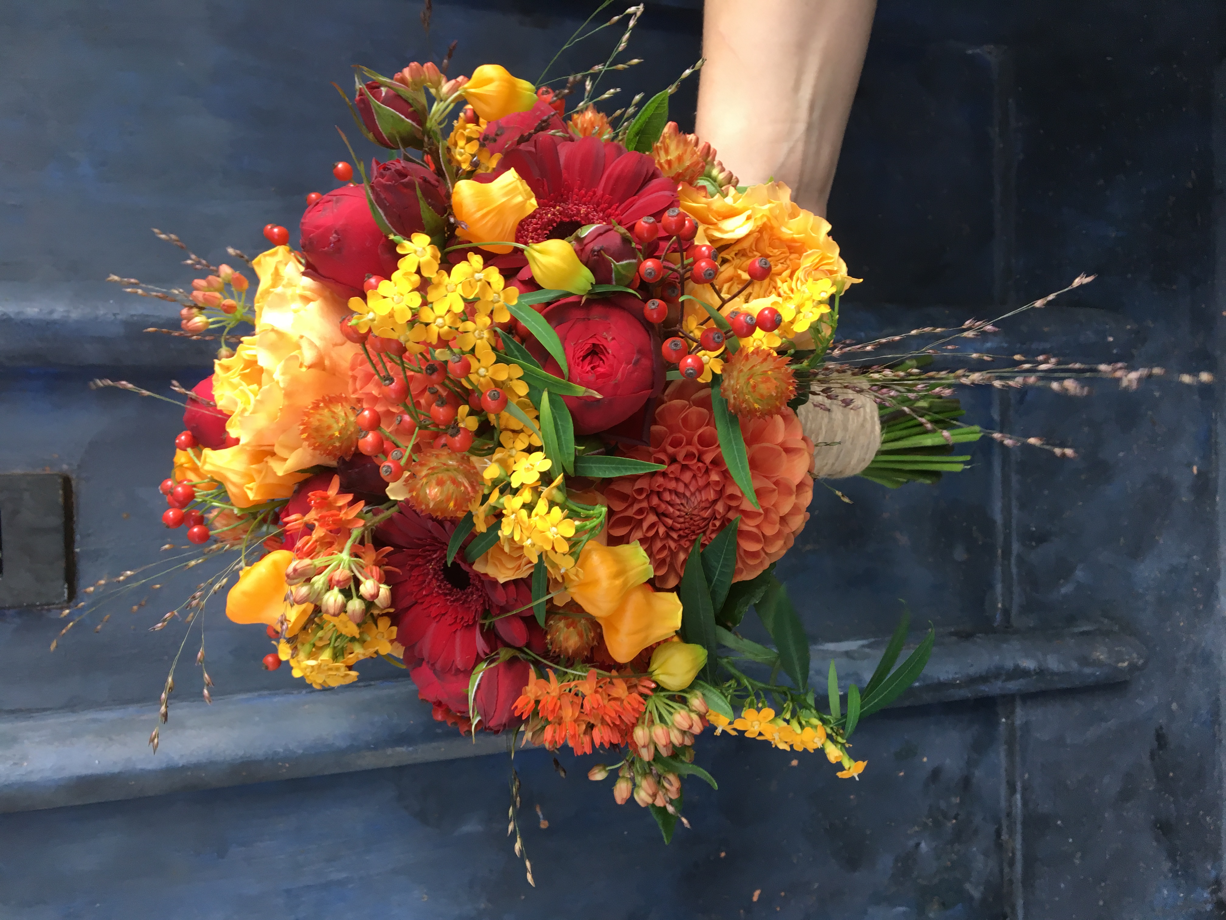 In het bruidsboeket zitten dahlia's, vetplantjes, rozen, klapbessen, hortensia, rozenbottels, viburnum en eucalipthus.