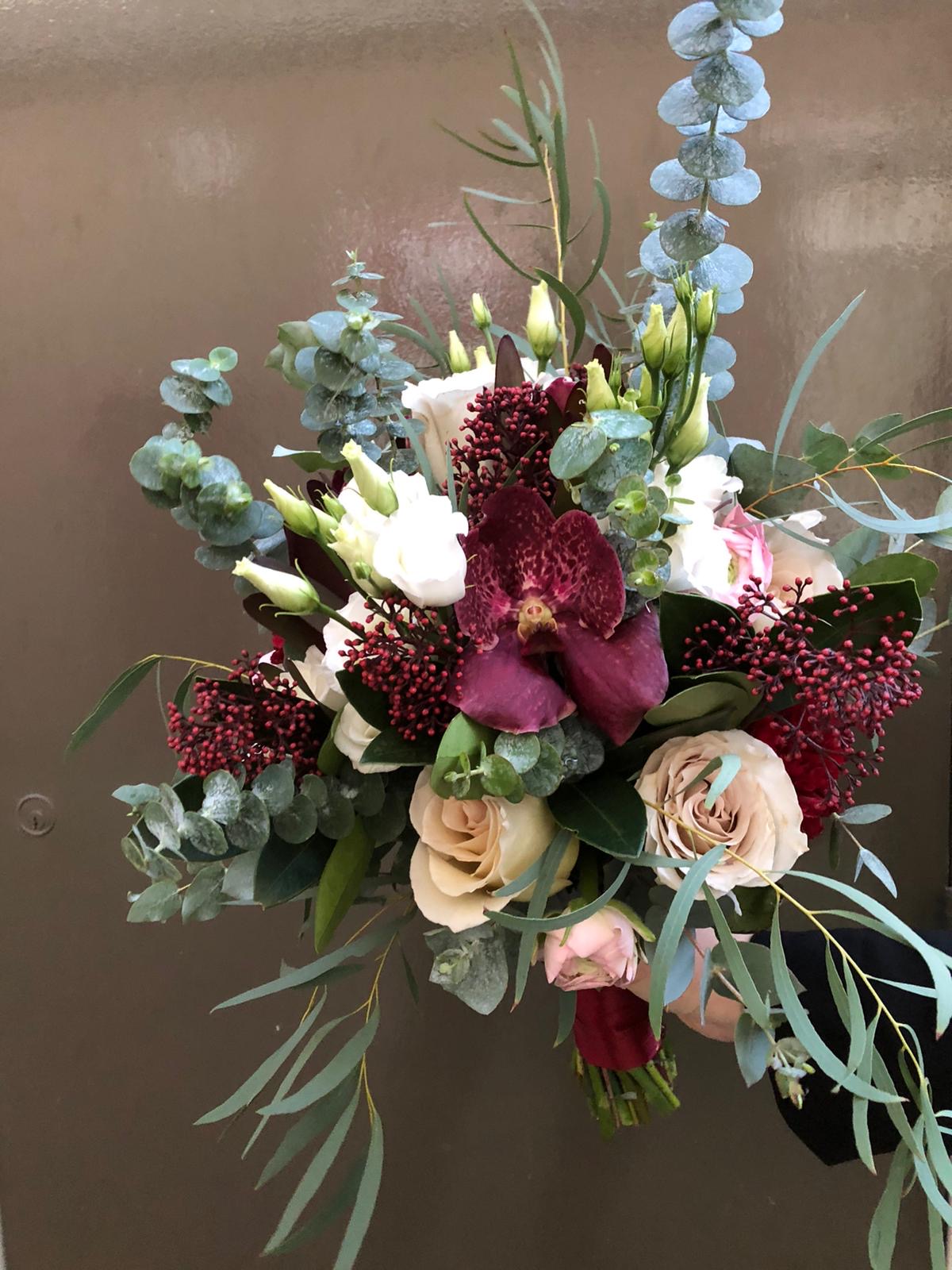 In het bruidsboeket zitten, vanda orchideeën, rozen, lisianthus, ranonkels, skimmia, en verschillende soorten eucalipthus.