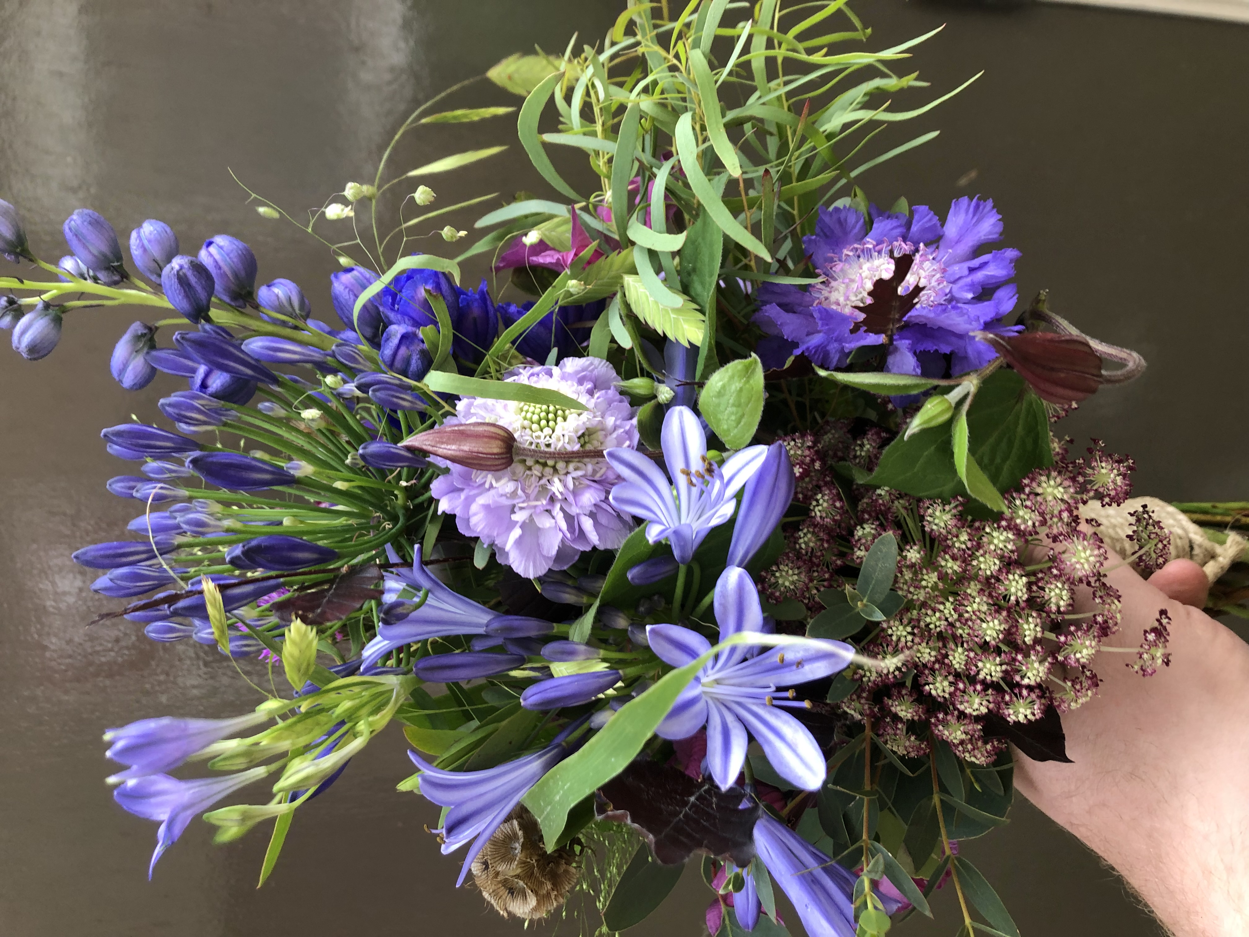 In het bruidsboeket zit, Dille daucus, delphinium, scabiosa, agapanthus, brodea, scabiosa, clematis en eucalipthus.