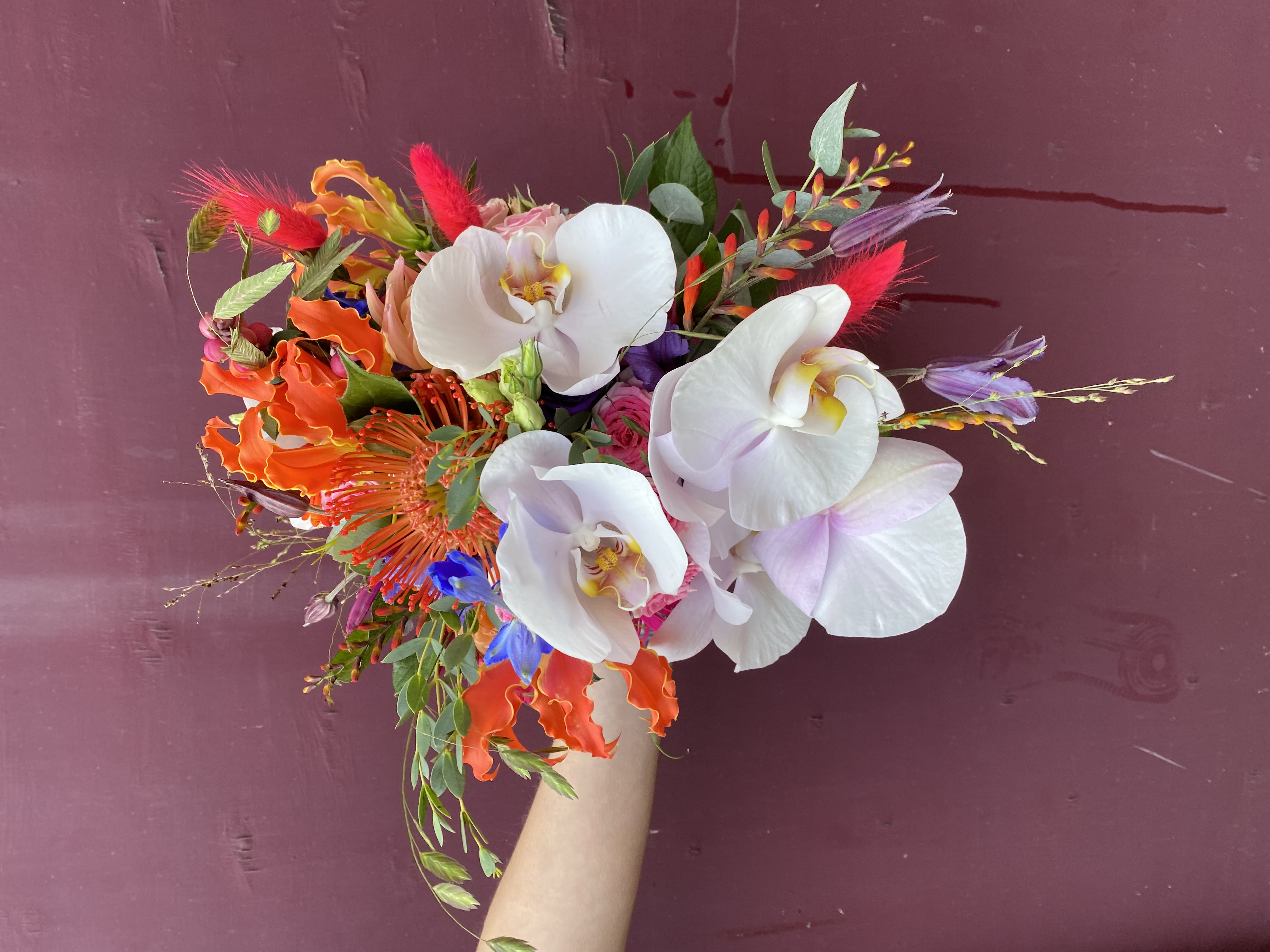 In het boeket zit: Gloriosa, nutan, orchidee, clematis, gedroogde pluimpjes, delphinium, clematis, grasjes, momtbretia en eucalipthus.