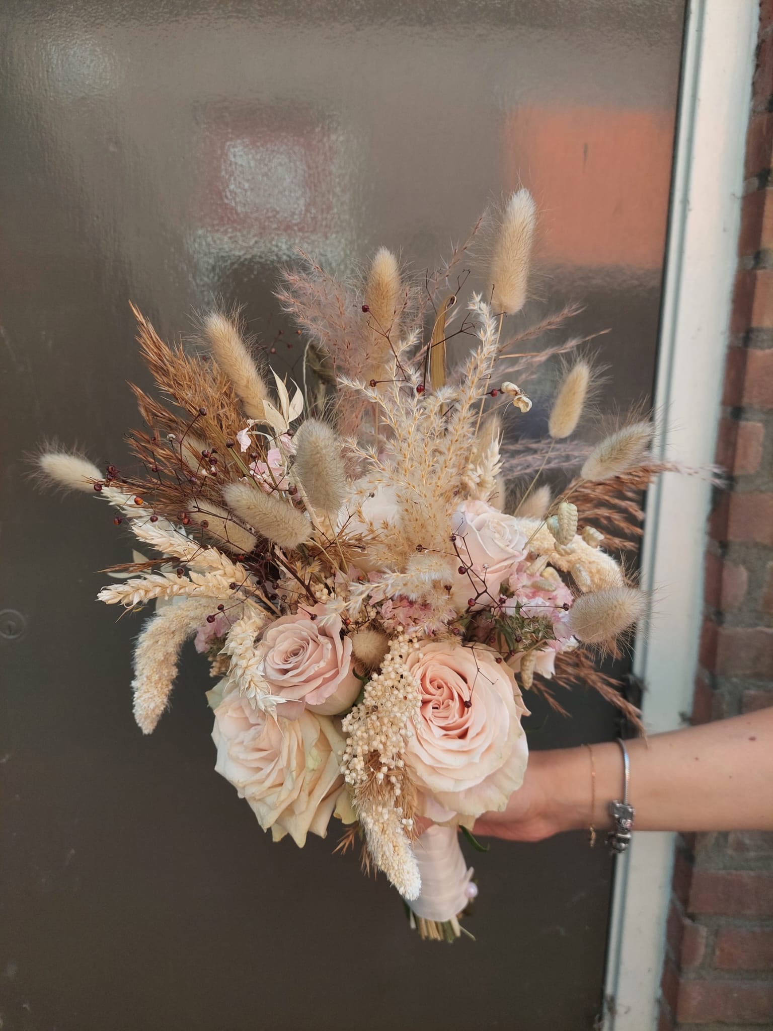 Bruidsboeket dry pinkEen bruidsboeket van verse bloemen en gedroogde materialen. In het boeket zit: gedroogde pluimen, rozen, trosrozen en grasjes.