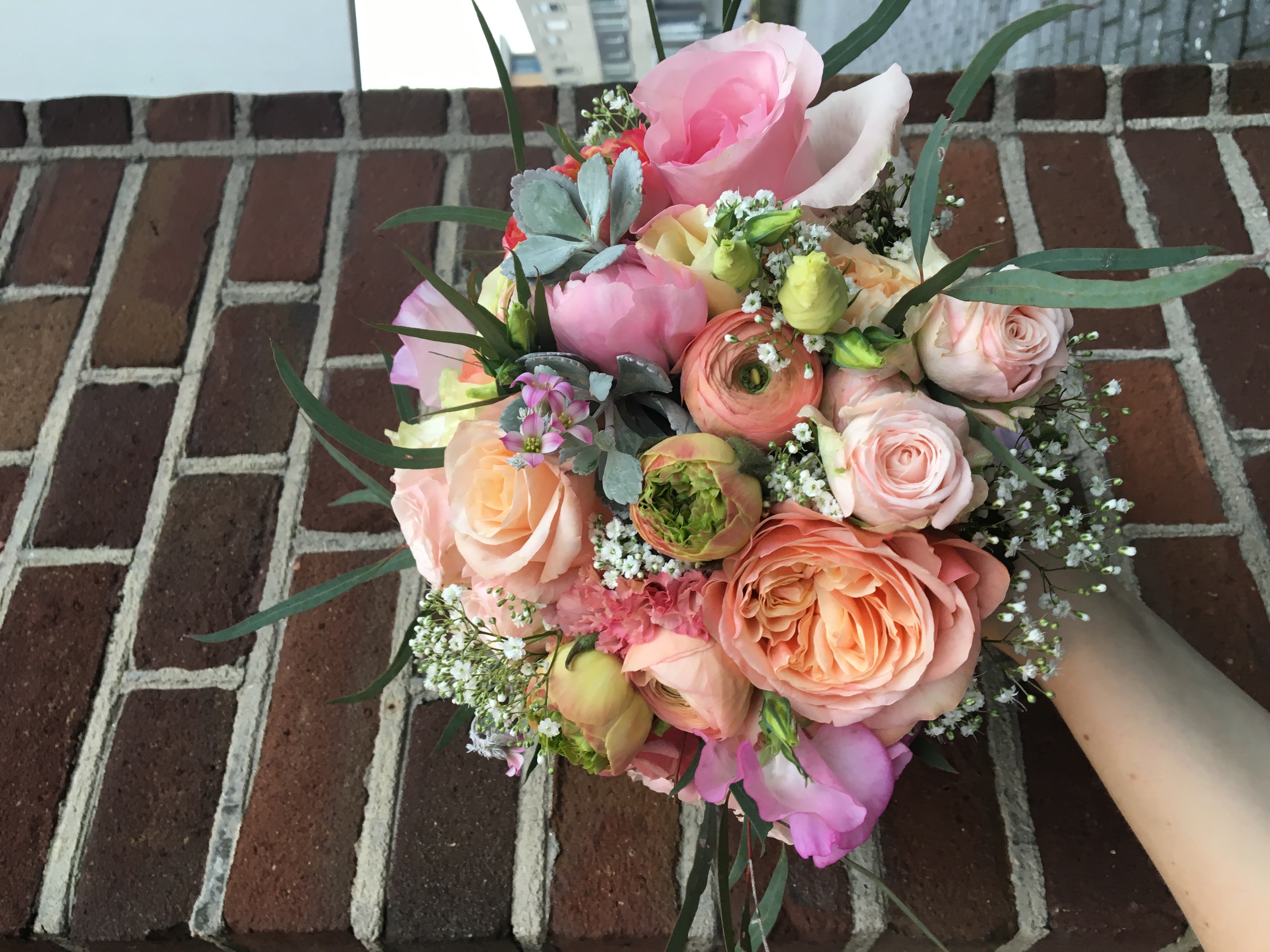 Bruidsboeket rozen en RanonkelsEen pastelkleurig bruidsboeket met rozen en ranonkels, lathyrus, trosrozen, vetplantjes, gipdskruid en eucalipthus.