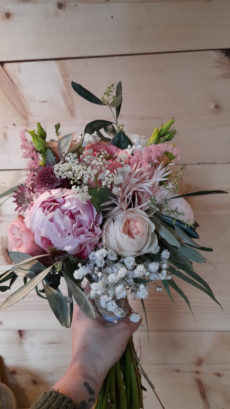 Met Rozen, pioenrozen, gipskruid, gasjes, trosanjers, scabiosa, lisianthus, trosrozen en eucalipthus.