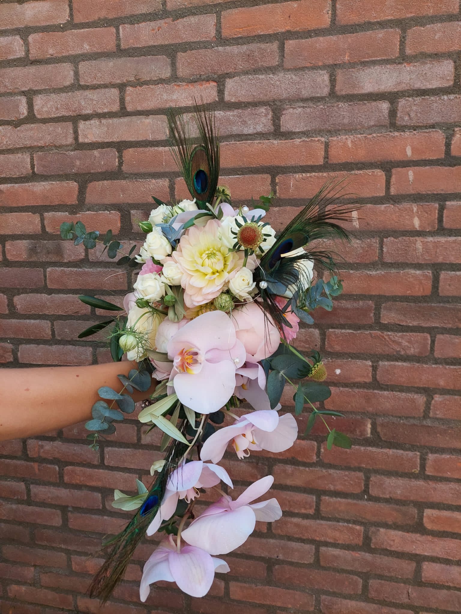 In het boeket zit: orchidee, dahlia, rudbeckia, juffertjes, pioenrozen, rozen, pauwenveren en eucalipthus.