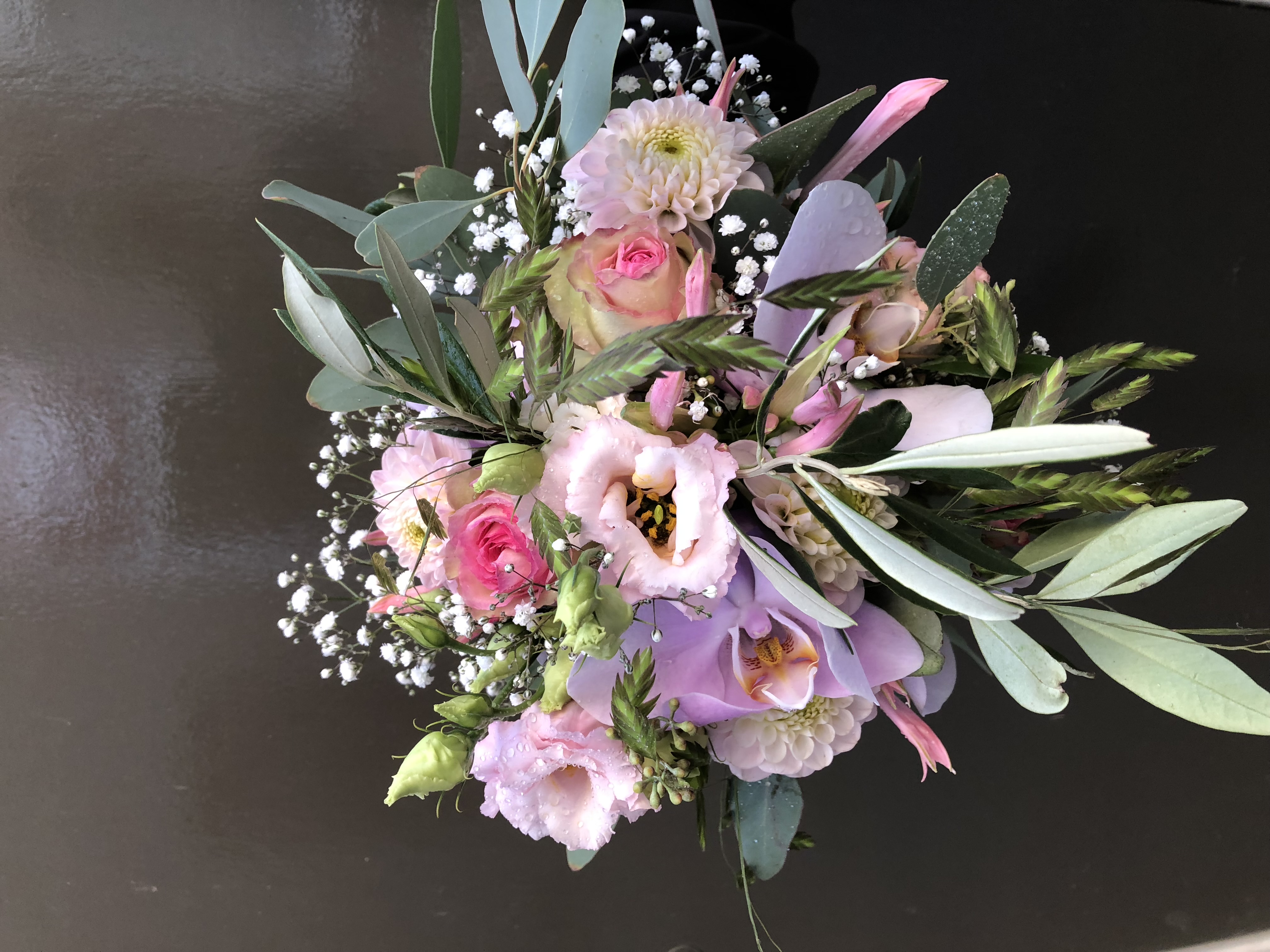 In het bruidsboeket zit, orchidee, nerine, gipskruid, grasjes, dahlia, rozen, lisianthus en olijfblad