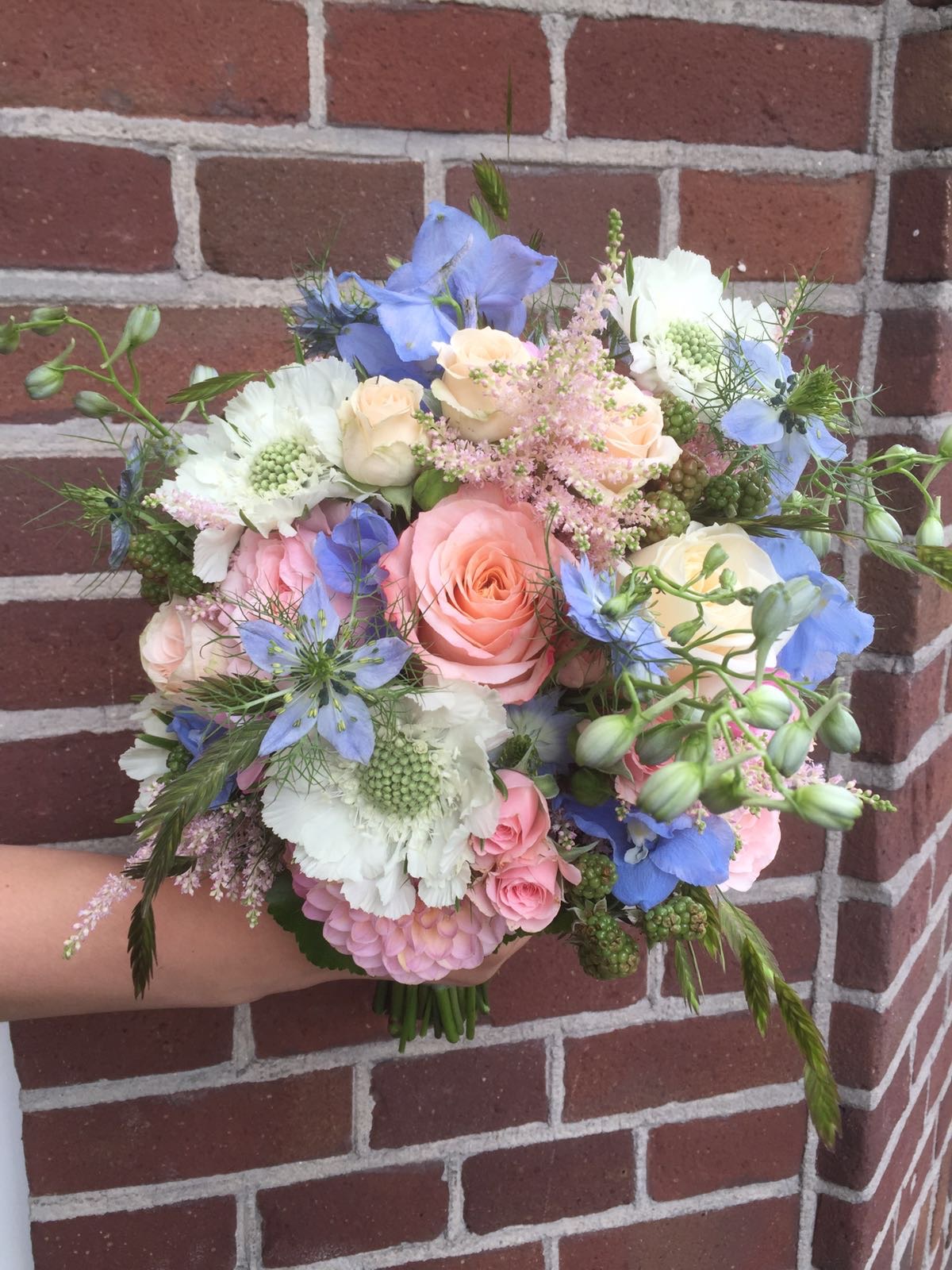 Bruidsboeket juffertje in het rozeEen speels maar rond bruidsboeket met zomerbloemen, zoals delphinium, dahlia, scabiosa, astilbe, juffertjes in het groen, trosroosjes en bramen.