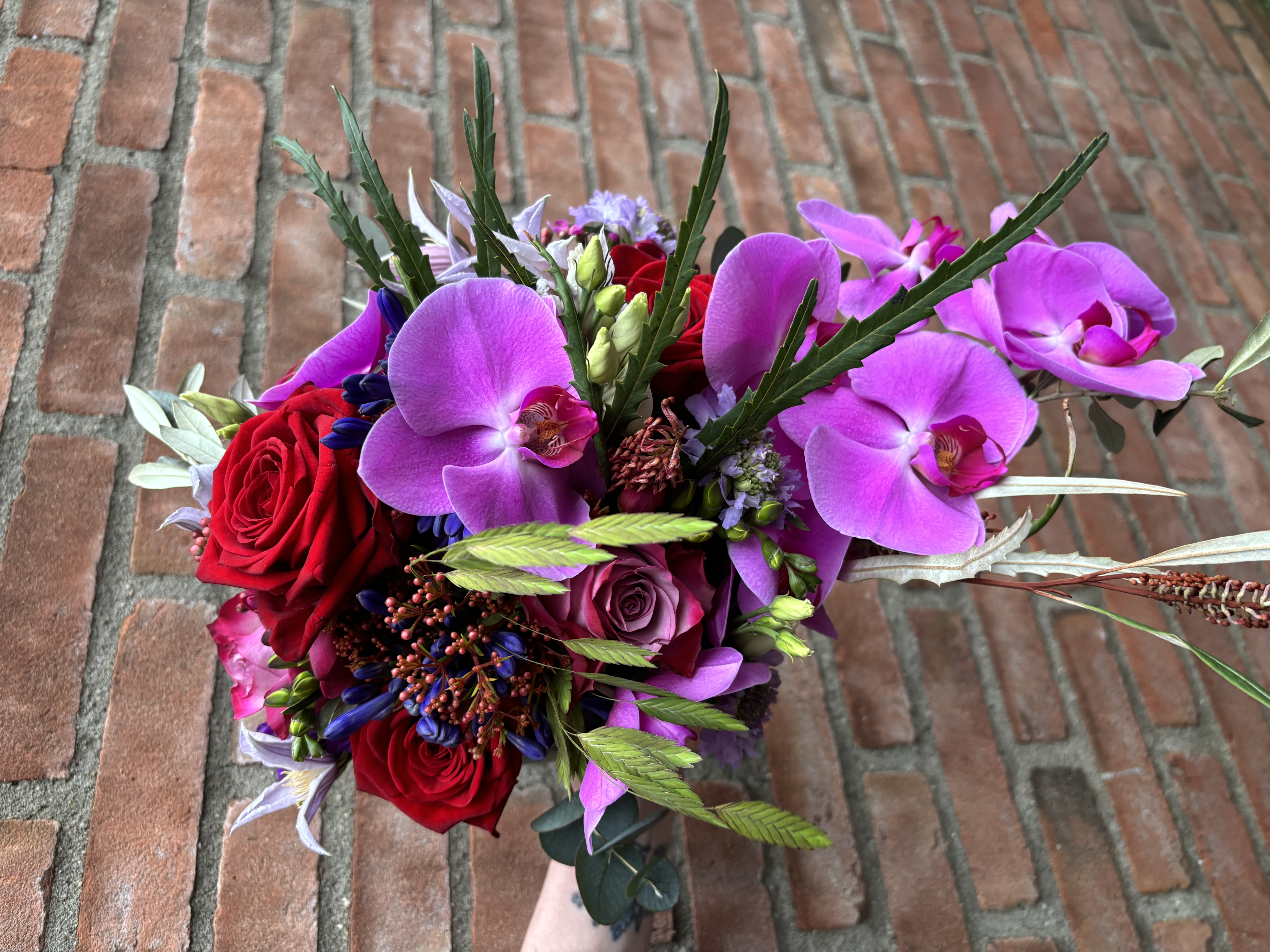 In het boeket zit: Rozen, grasjes, skimmia, agapanthus, lisianthus, oprchidee, clematis, freesia en grevilea groen.
